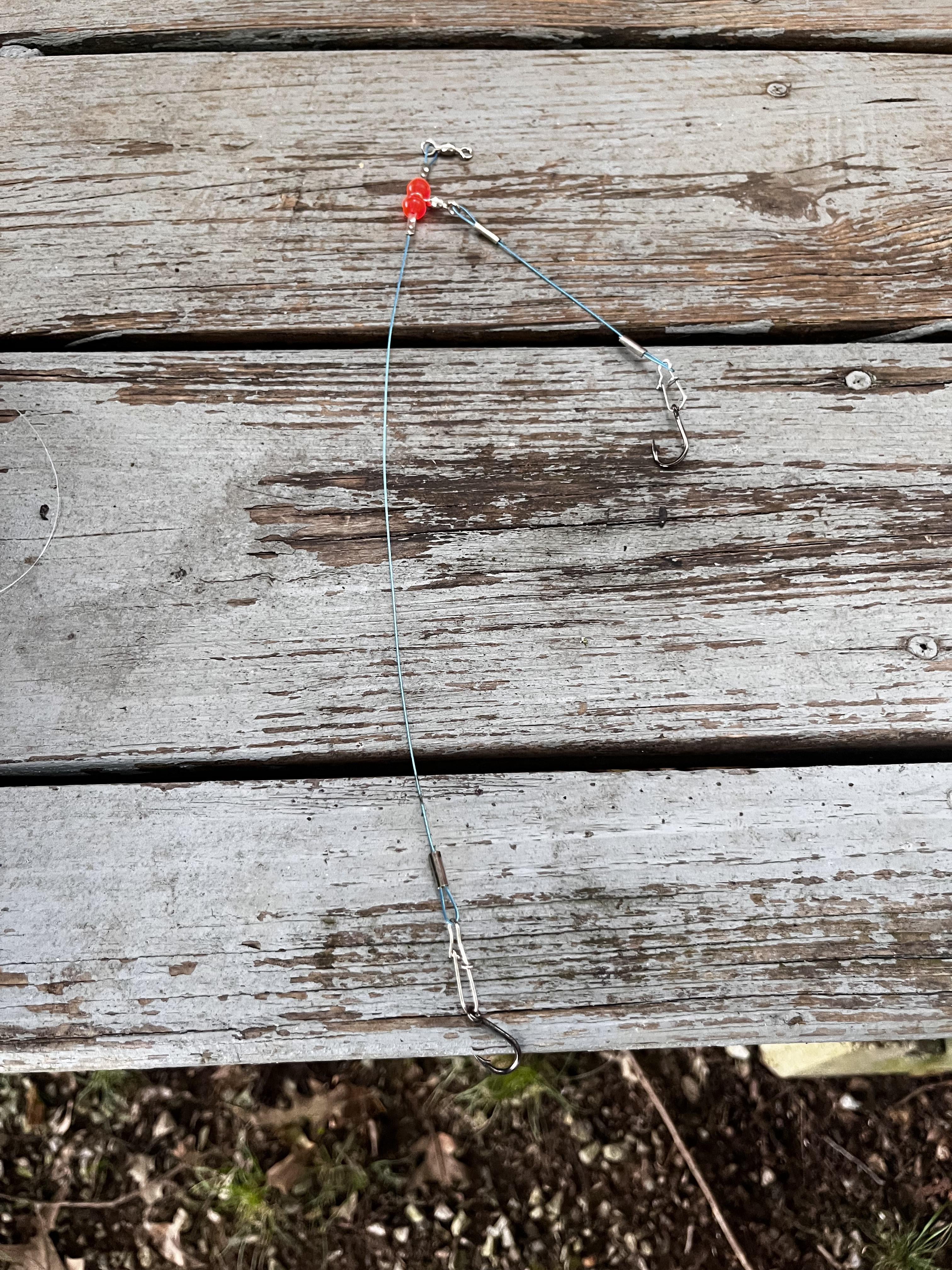 That is a single dropper rig. Made with cable to prevent fish from biting through. The bottom clip is for your weight, not another hook. It’s bottom weighted to keep your bait up off the bottom .