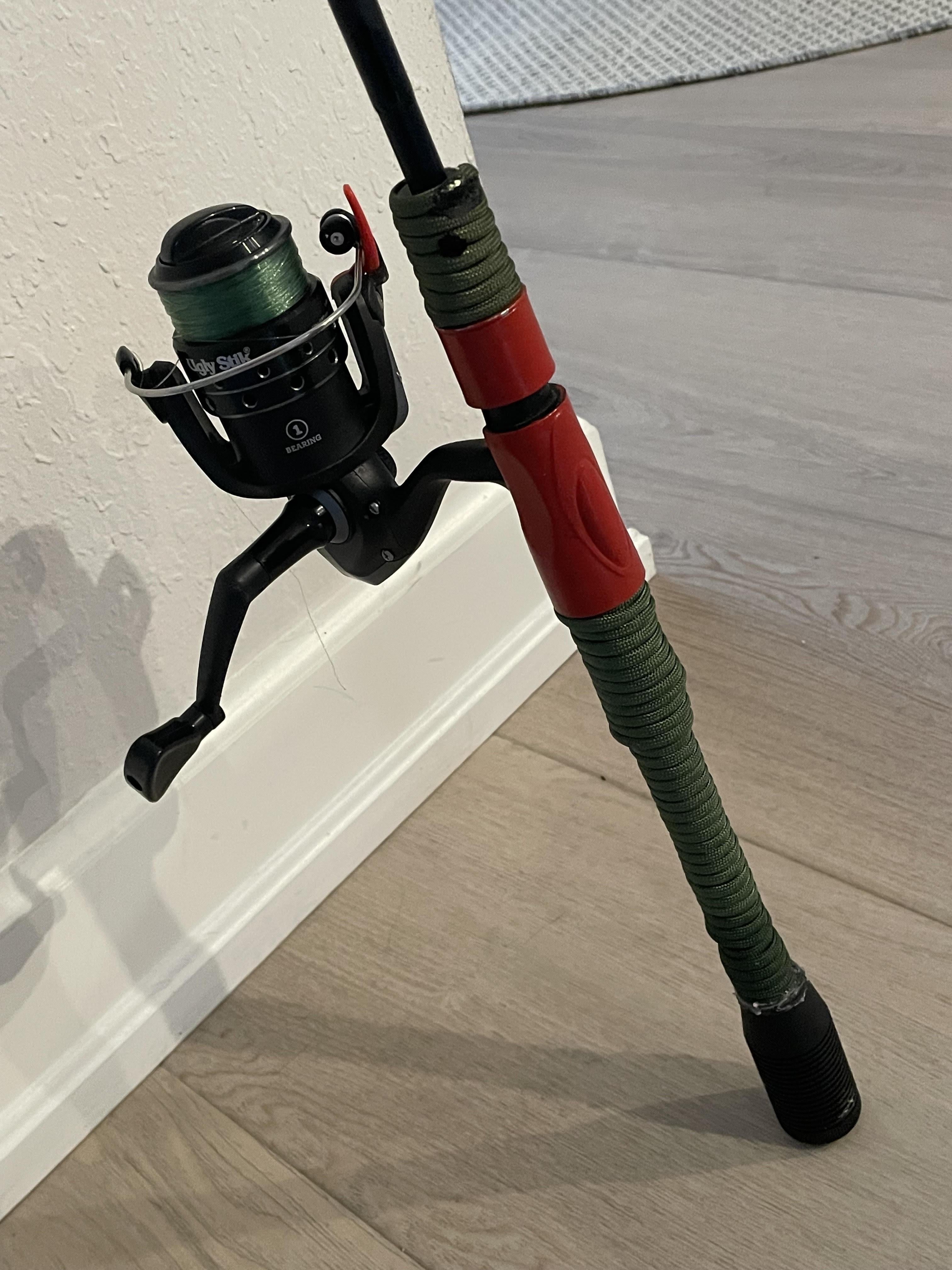 Got the idea from /u/laguna_shredder earlier. Had this old Fin-Nor lying around and decided to try it myself. The cork that was on it was half rotten away so why not, right? Rod has seen some shit so I hit it with some black rattle can and then some red engine enamel on the reel seat. I taped off where the reel actually contacts though. The butt is a cut down vertical foregrip that I filled with hot glue lol. Turned out great in my opinion!