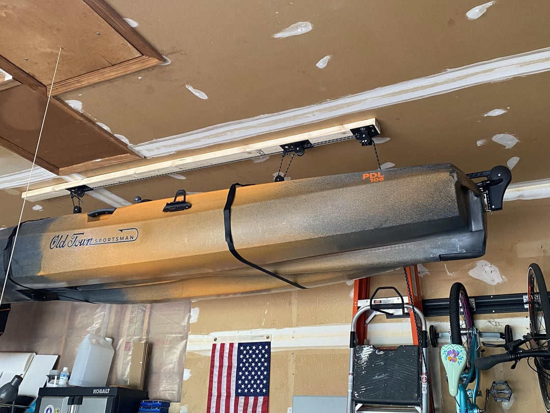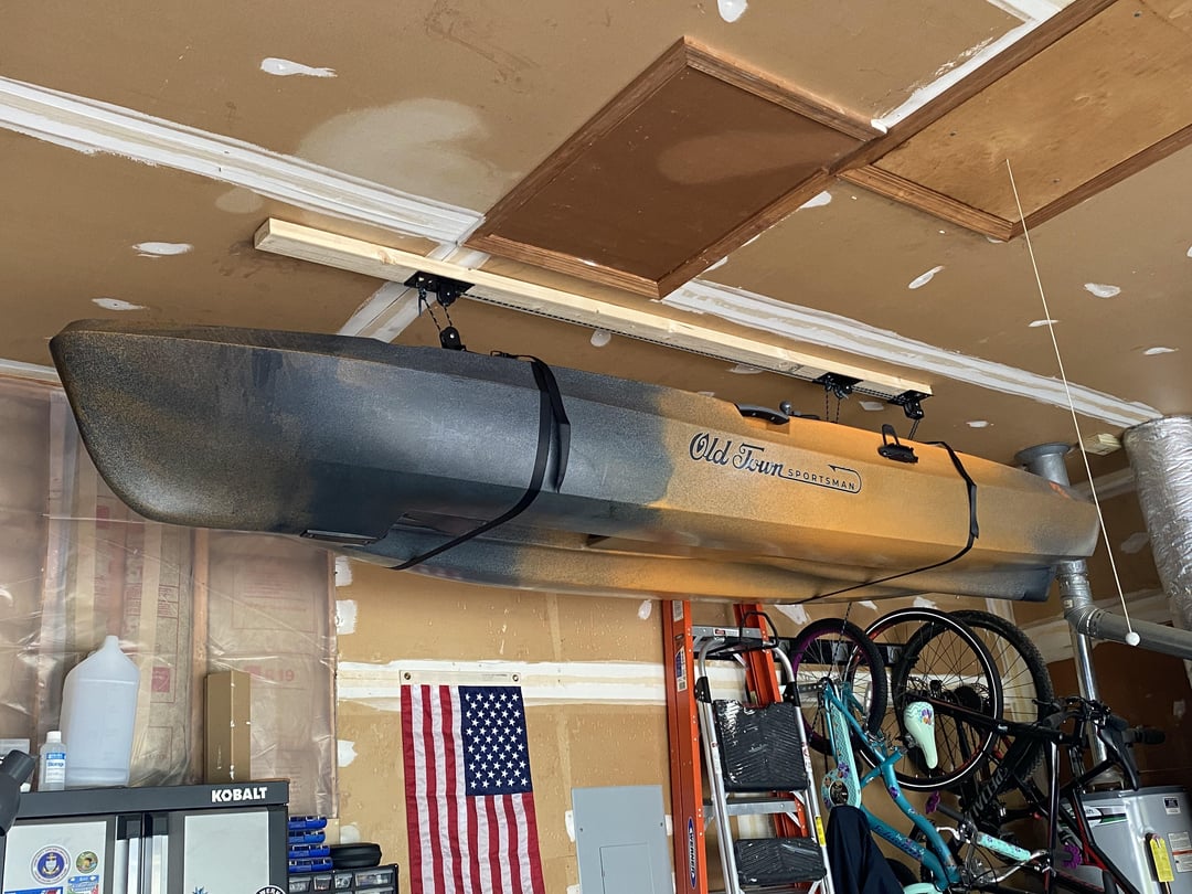 Just got my new oldtown 106 pdl. This is how I rigged it up to store it although my buddy tells me that the hull will warp. Any recommendations are appreciated!