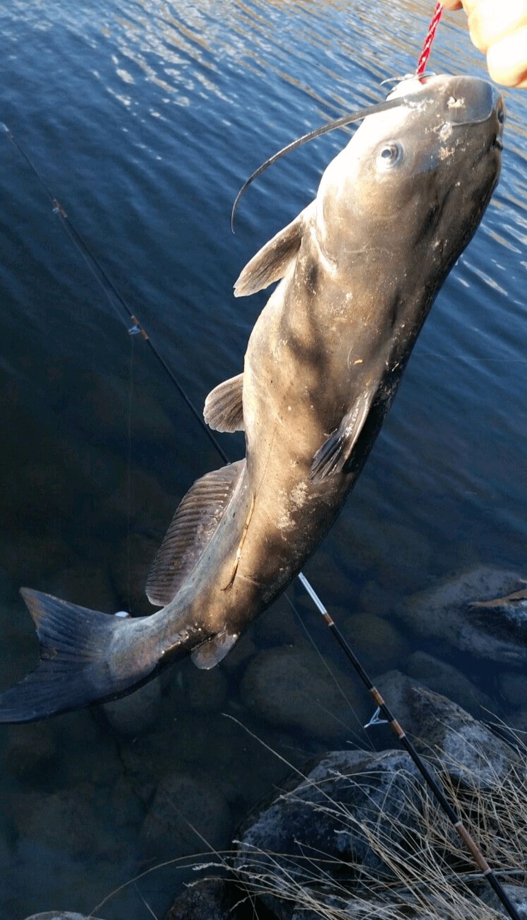 I did panic a little lmao! But I grabbed the rod out of it's hold and set the hook as if I had a shark on the other end of my line haha. I then proceeded to fight for my life! I've never fought a fish as strong as this guy, it lasted a good 2 or 3 minutes. I think this is because the fish swam out of the eddie I was in into the river current. But it was so exhilarating! I finally got him in close and I've never caught, let alone handled a catfish so I was a little nervous I was gonna get spined, but I managed to get him on the stringer and now me and my oldest daughter have lunch! (Catfish recipes wanted btw)