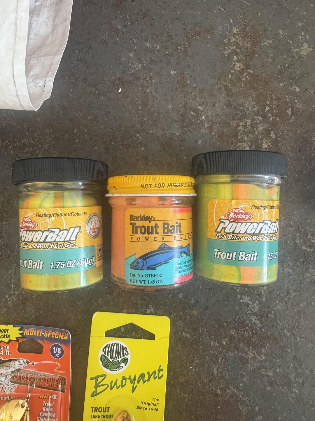 Also have weights, snapshots, bobbers, hooks, garlic scent liquid,