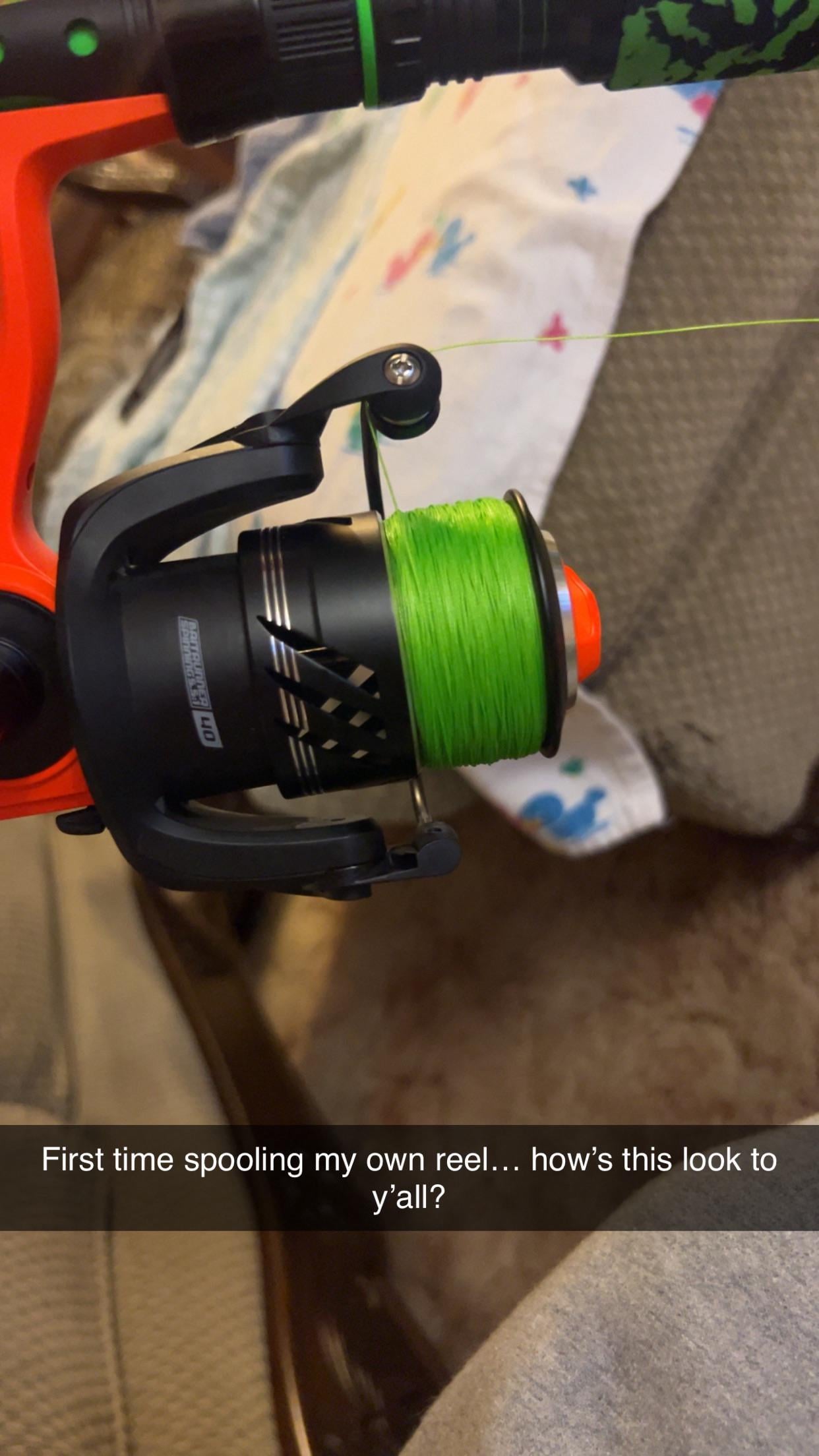 Just got a new catfish setup and had to spool the reel, never had to before. How’s this look? 50 pound braid. Posted by ItsTheCougs