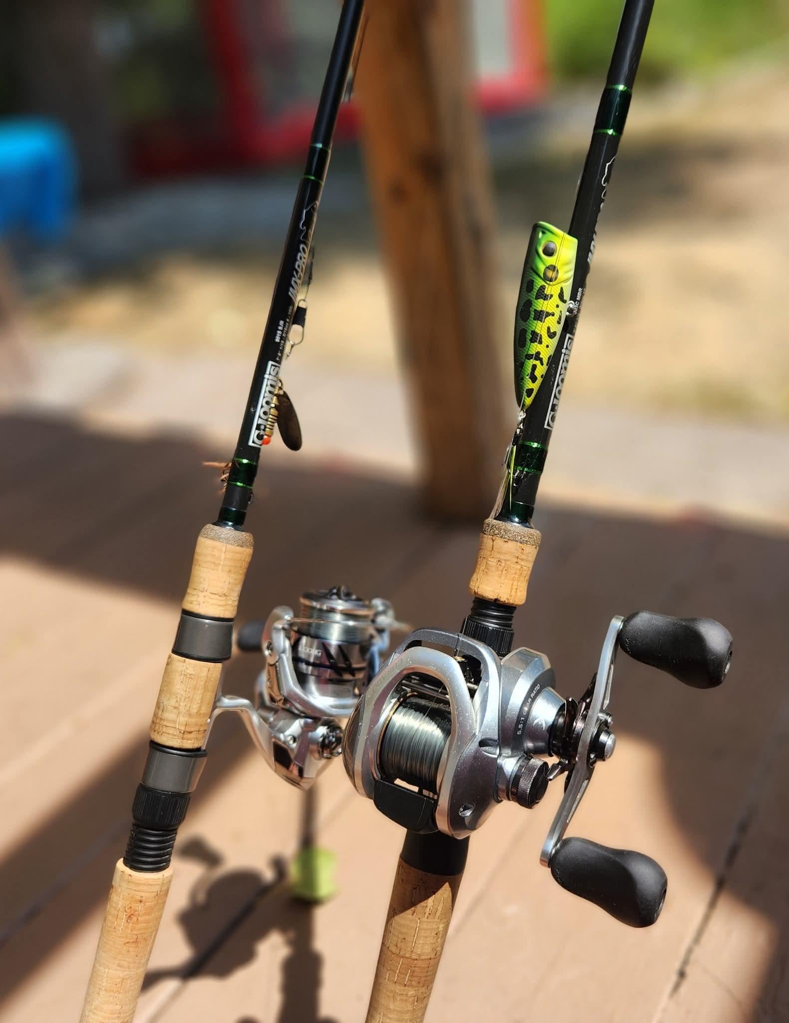 A cool pic of my main setups, the imx pro SJR 901s and MBR 903c with Shimano stradic and curado reels. I'd give my right leg away to be able to fish with the next level up, new glx rods with Sustain and Bantam reels lol