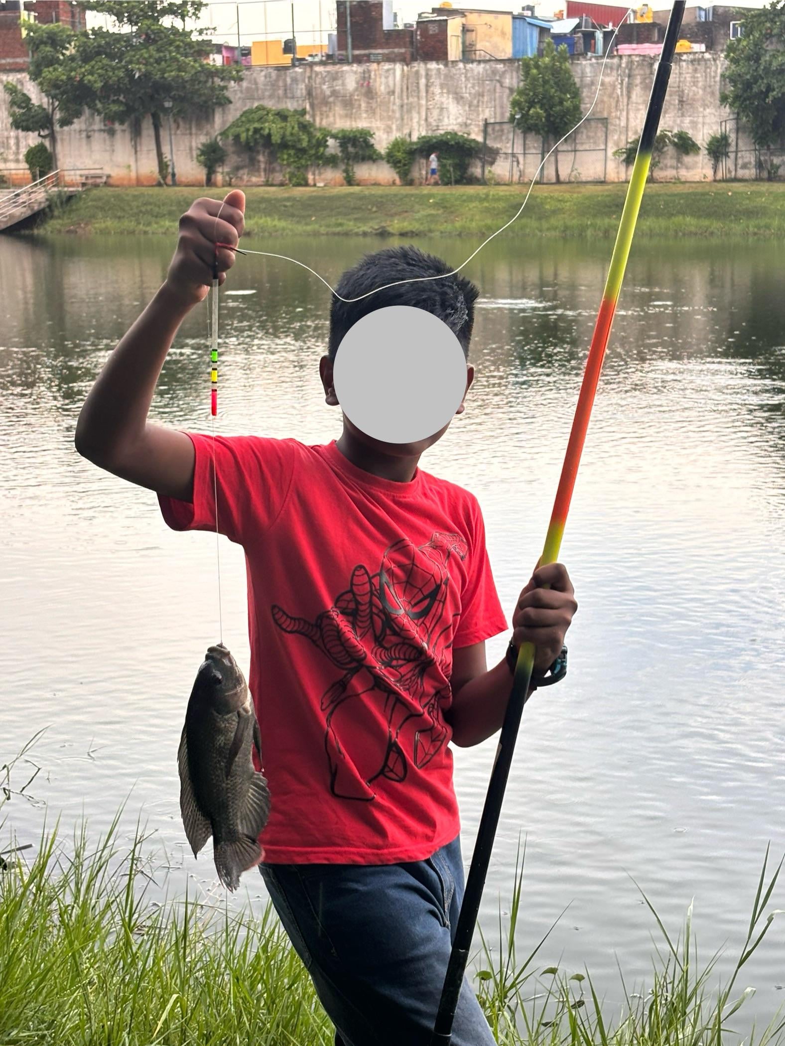 I mean I’ve been taking him for this spot (in Chennai, India) for sometime. At times he gets quite annoyed when there’s no bite, jumps out with fear when I catch something and show him.. But today, I’ve let him handle the rod and voila, he got some of tilapias and handled it without hesitation. Of course he will not touch the fish.. I believe he will get used to fishing going forward.