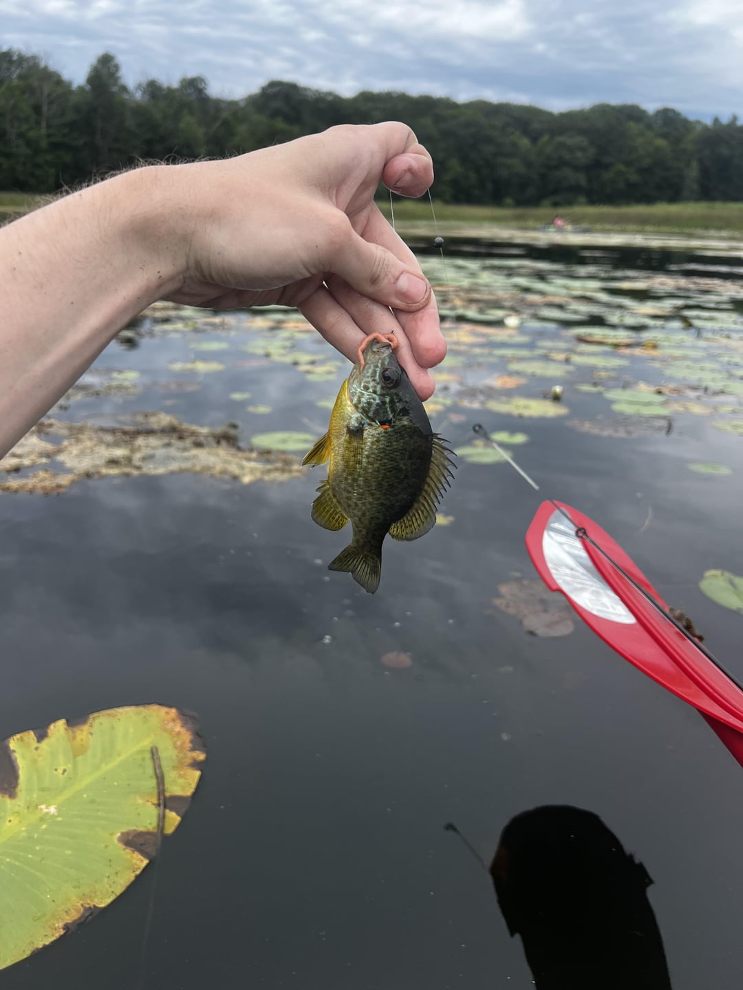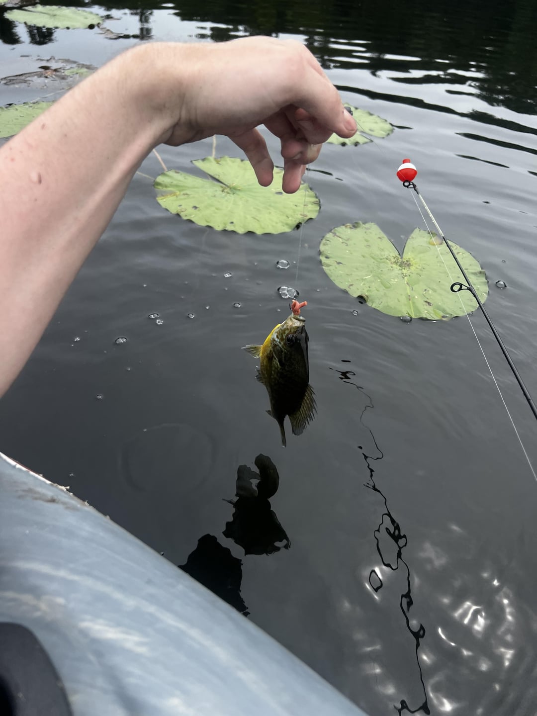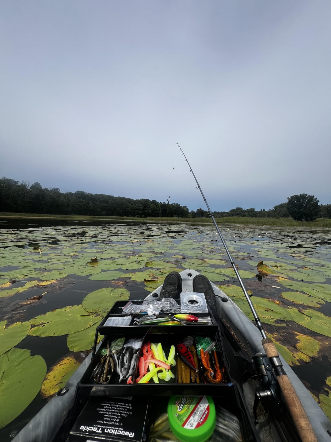 Northern MI. Caught a bunch of bluegills at Lake 1, started raining, then headed out to Lake 2. Was hoping to get some bass…ended up with TWO pike! Had to call across the lake “Hey guys…what do I do if I caught a pike?!?!” They had to help me get it unhooked since I had no clue what I was doing. Was using a hook and worm for the gills, and then a 1/2oz spoon for the pike. Had a great time.