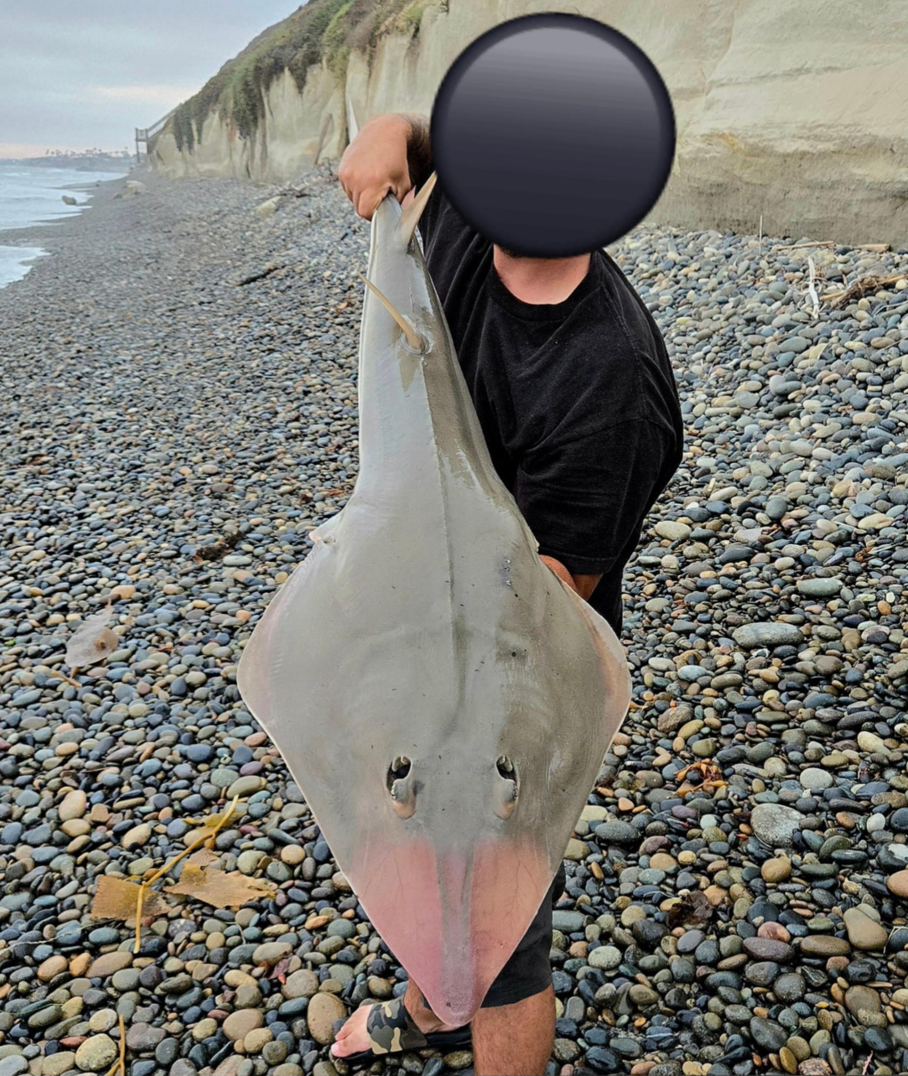 Snagged this monster guitarfish throwing a Texas rigged swimbait for halibut. Felt a tap, set the hook, and my reel starting wailing. I thought I had another white seabass because of the shear power in the run, but I started to get skeptical as it proceeded to relentlessly run another 4-5 times (white seabass tire significantly after first 1-2 runs). I was running 15lb flurocarbon leader and it took me 30-40 minutes to bring it in because it did NOT want to come in. Straight standstill for about 10 minutes where he wasn't taking line but I couldn't move it. For reference I am 6'1" and 235lbs. Not the target species but by far the largest fish I've landed in the surf. Released. Any guesses on weight here?