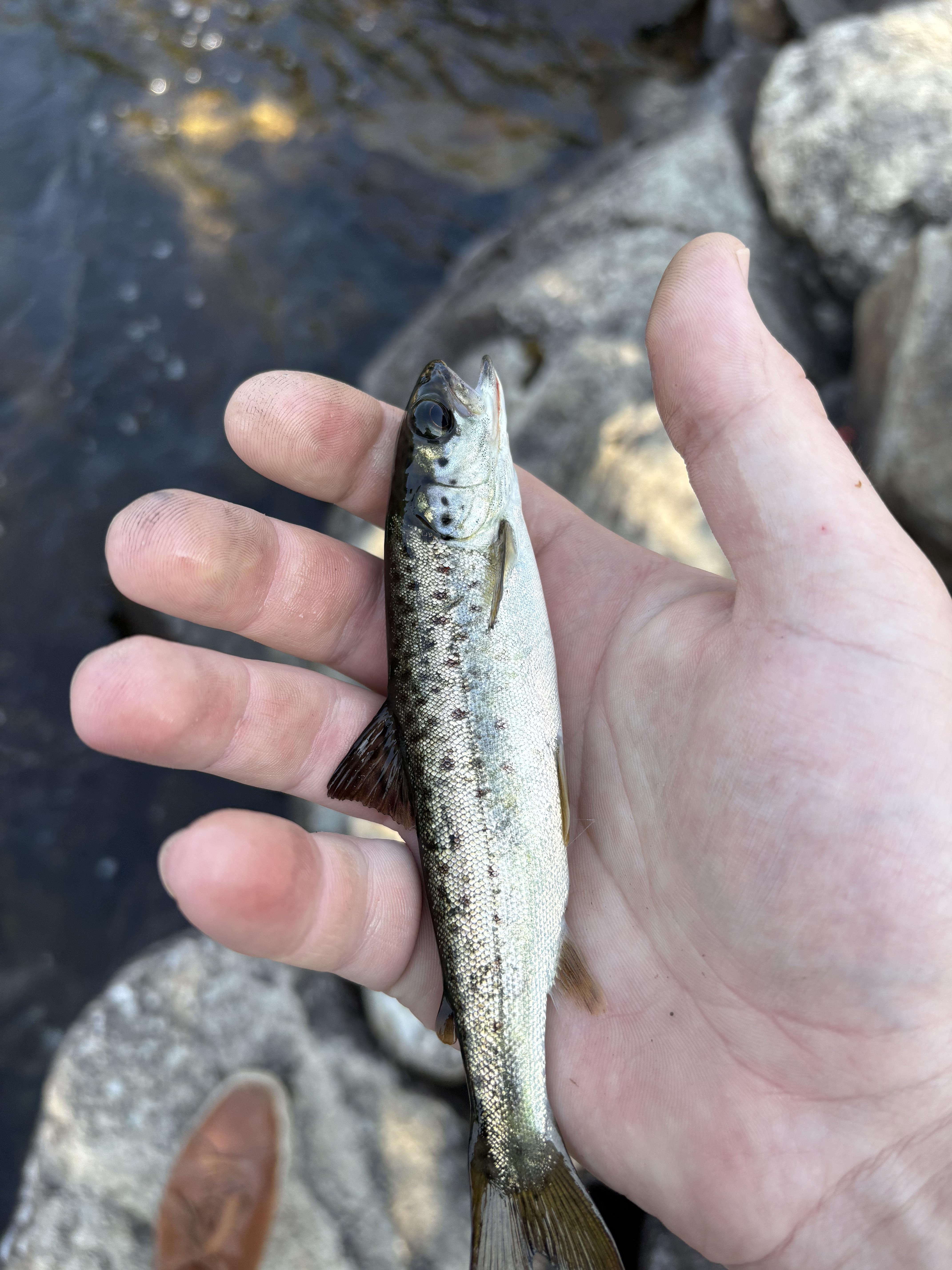 (Hand was wetter than it looks in the picture) Caught under a dam spillway in northwest Maine, I’m not so good at identifying them this young. Jaw and spots look salmonish, but the slight orange on the adipose fin is giving me pause.