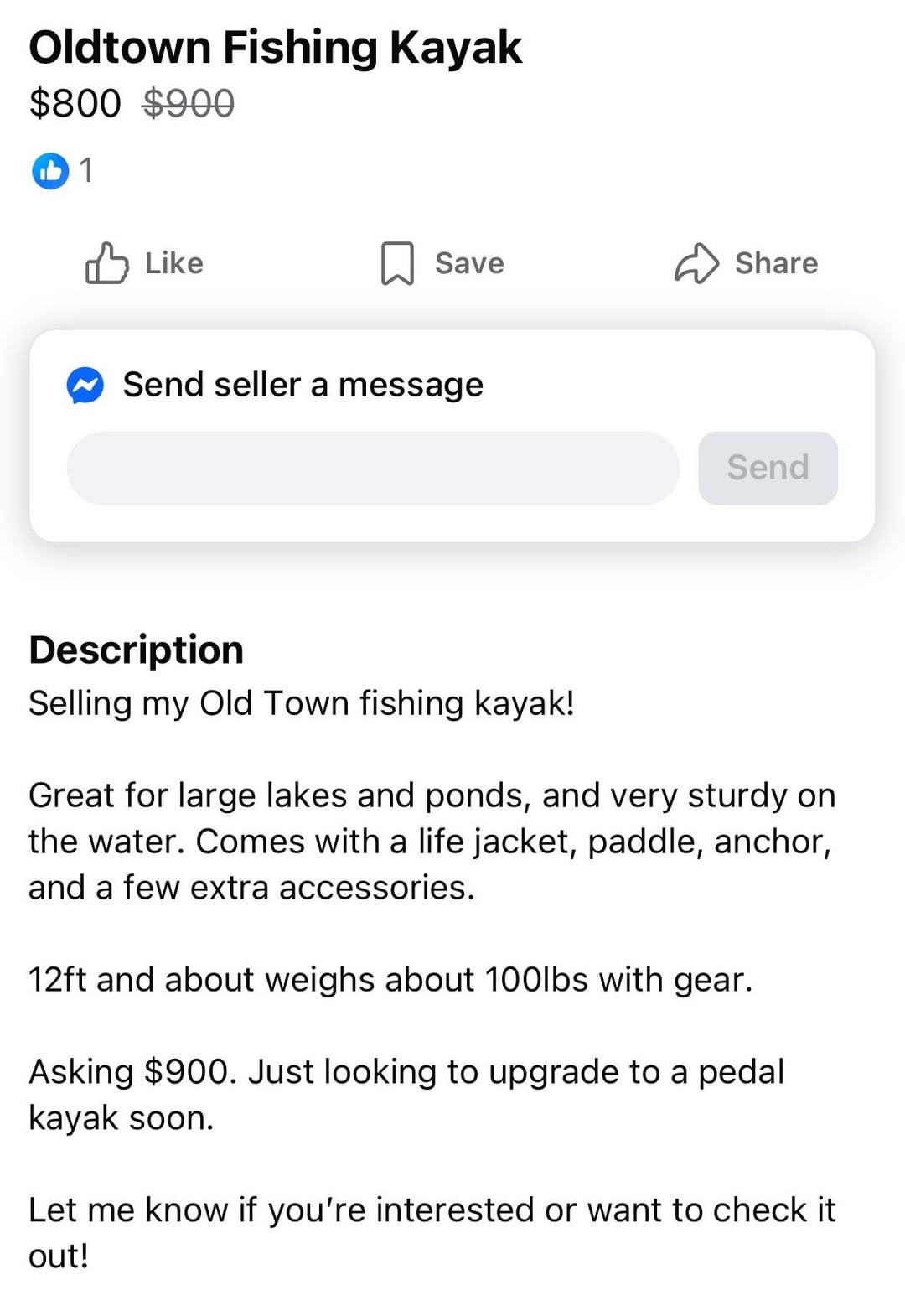 First time kayak fishing and buying a kayak, he is willing to go down to 600 and is throwing in a Garmin Striker 4.