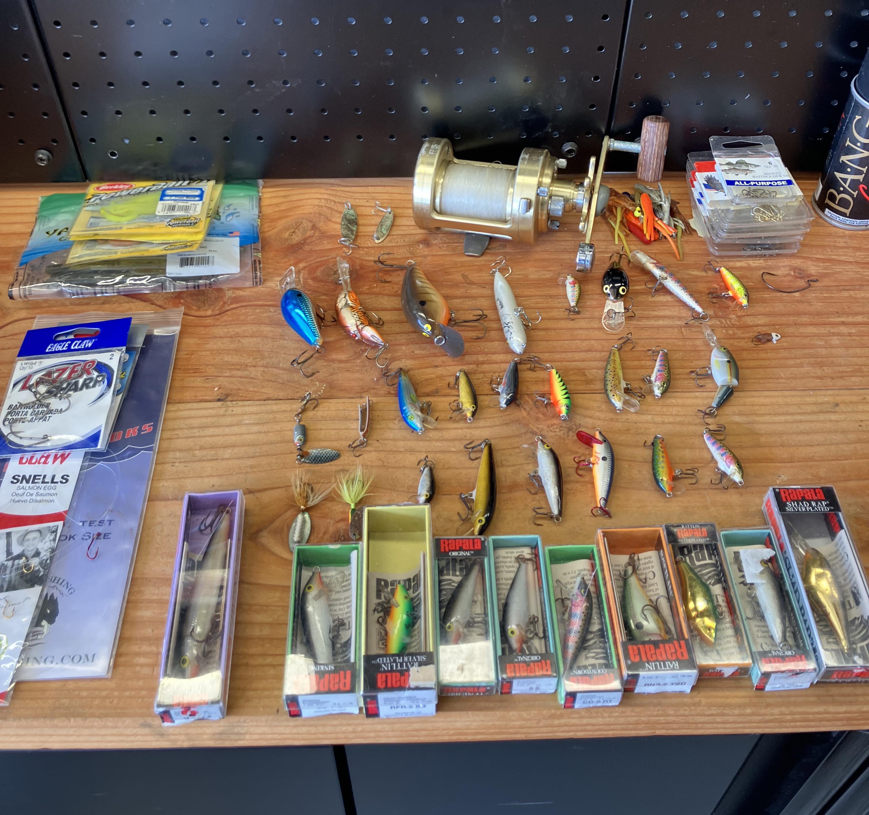 Got all this for $200. 30 Rapala lures, couple kastmasters, Calcutta 700s, assorted hooks, some plastics that were still good. Not shown knife, pliers, tackle box and 2 3600 cases. Posted by n0apologies