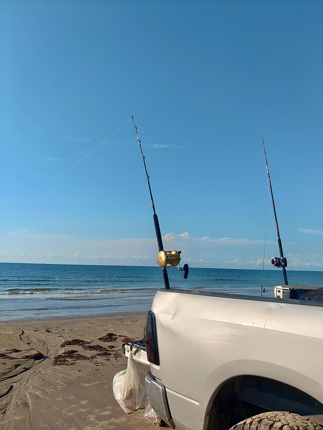 It's not often the Gulf Coast of Texas gets water like this… When I pulled up I saw tons of people going for trout but I guess it was a bad day to try to get sharks… No current… Had three rods at three different distances furthest one at three thousand feet.. i was using bonita, ray, and squid and after four hours packed it up and called it…. I've been getting skunked on shark over two feet for a while now… Been pulling in tons of gafftops and flat heads and small sharks but if anyone has any suggestions on landing some big boys I'm all ears…