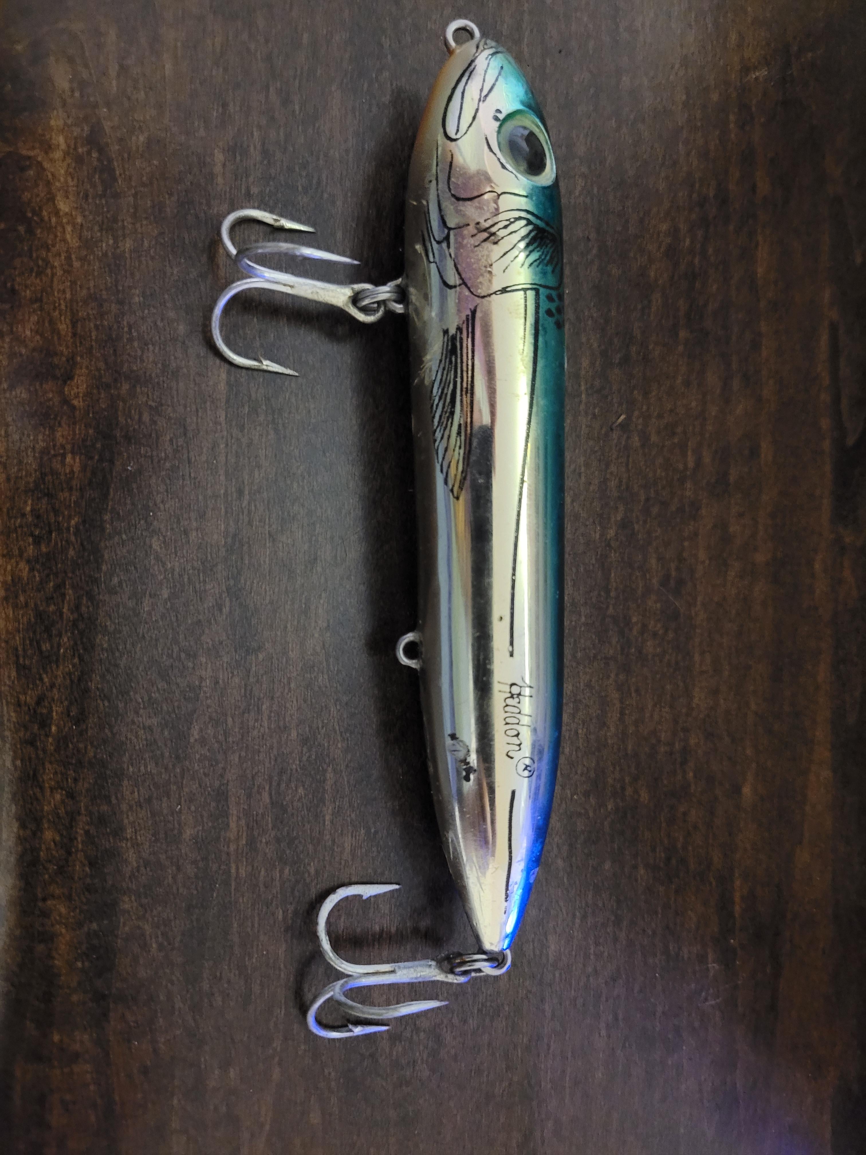 Yes, there’s supposed to be a third hook. Yes, it’s a classic top water” walk the dog” plug, a Heddon Spook. Good for bass and just about anything else that will hit a top water lure.
