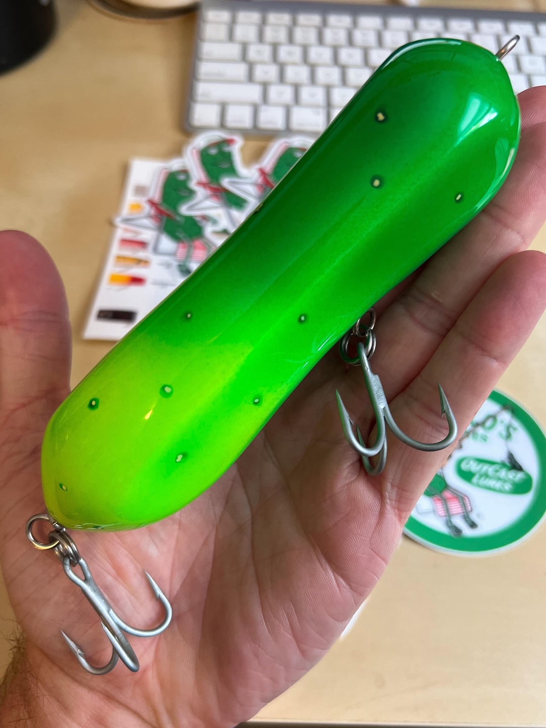 Almost exactly a year ago the fine folks at Grillo’s Pickles sent me a limited edition lure they did in collaboration with Outcast Lures. It’s a super nice quality handmade topwater plug, made out of cedar. This past Sunday I finally got to put it to use, and it worked!