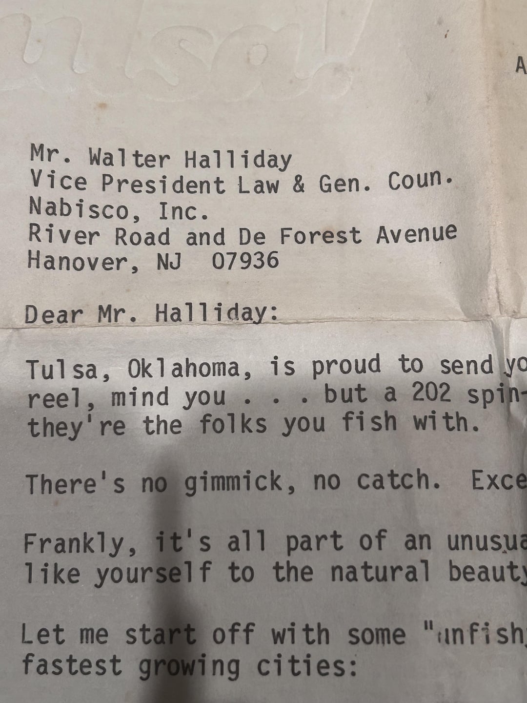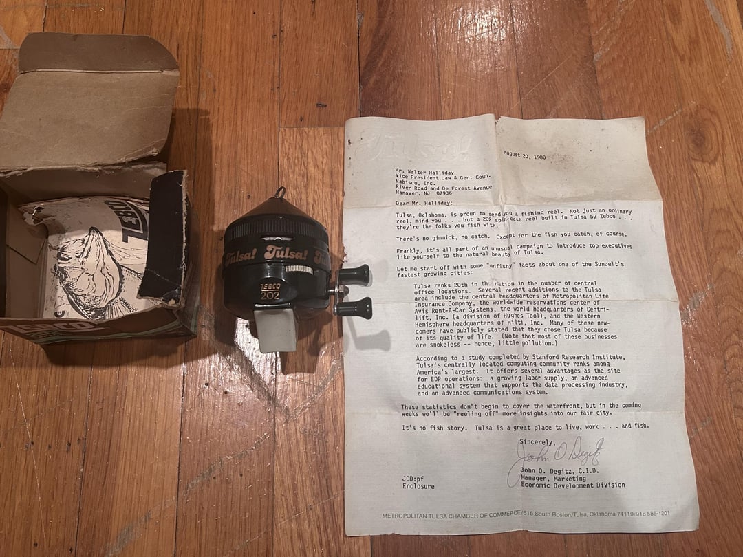 Got this reel at a yard sale years ago from the back of a shed in New York. Just want to see if anyone has another with letter? It’s basically a special edition 202 with Tulsa around the reel. Accompanying it is a letter from the economic development division of Tulsa OK, asking Nabisco to relocate to Tulsa and giving him this fishing reel as a gift. It is dated 8/20/1980. Brand new as well! I emailed the Tulsa, Ok economic development and they had not idea of the campaign or who these were sent to. An interesting piece of history.
