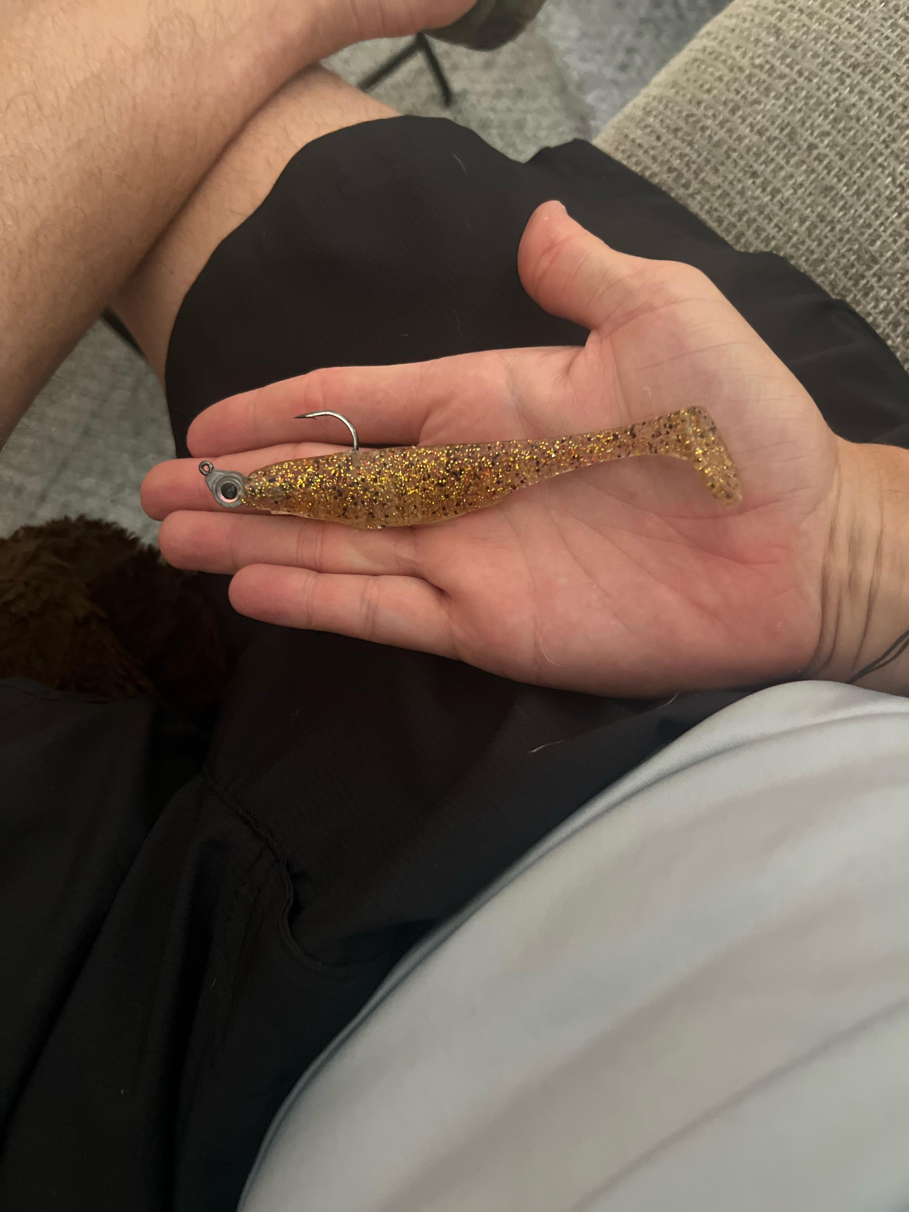 Hello all stupid question as shown in the photo I have a 5” paddle tail on a 3/0 jig head.Is there enough hook here lol? Posted by Due_Frosting_8779