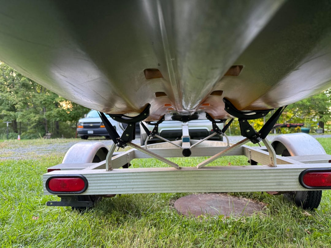 Picked up an old jet ski trailer. Took off the bunks, shifted the bow support forward, put some cheapo kayak saddles on the bunk supports, and away we go. Planning on replacing the saddles with bolt on ones now that I know it works.