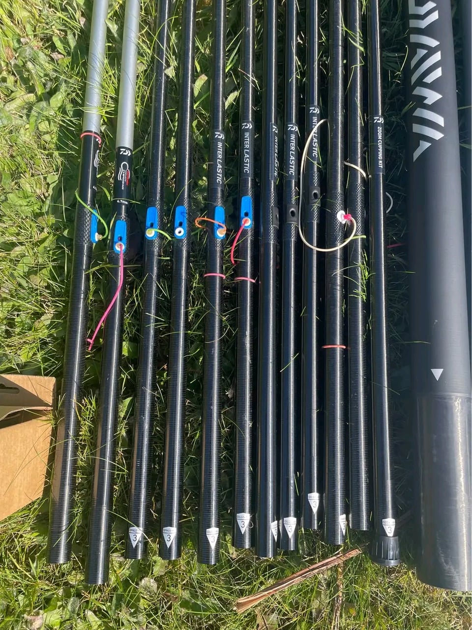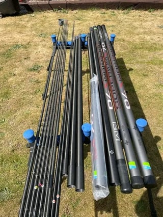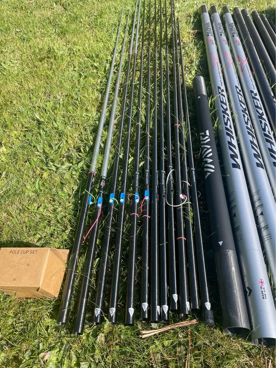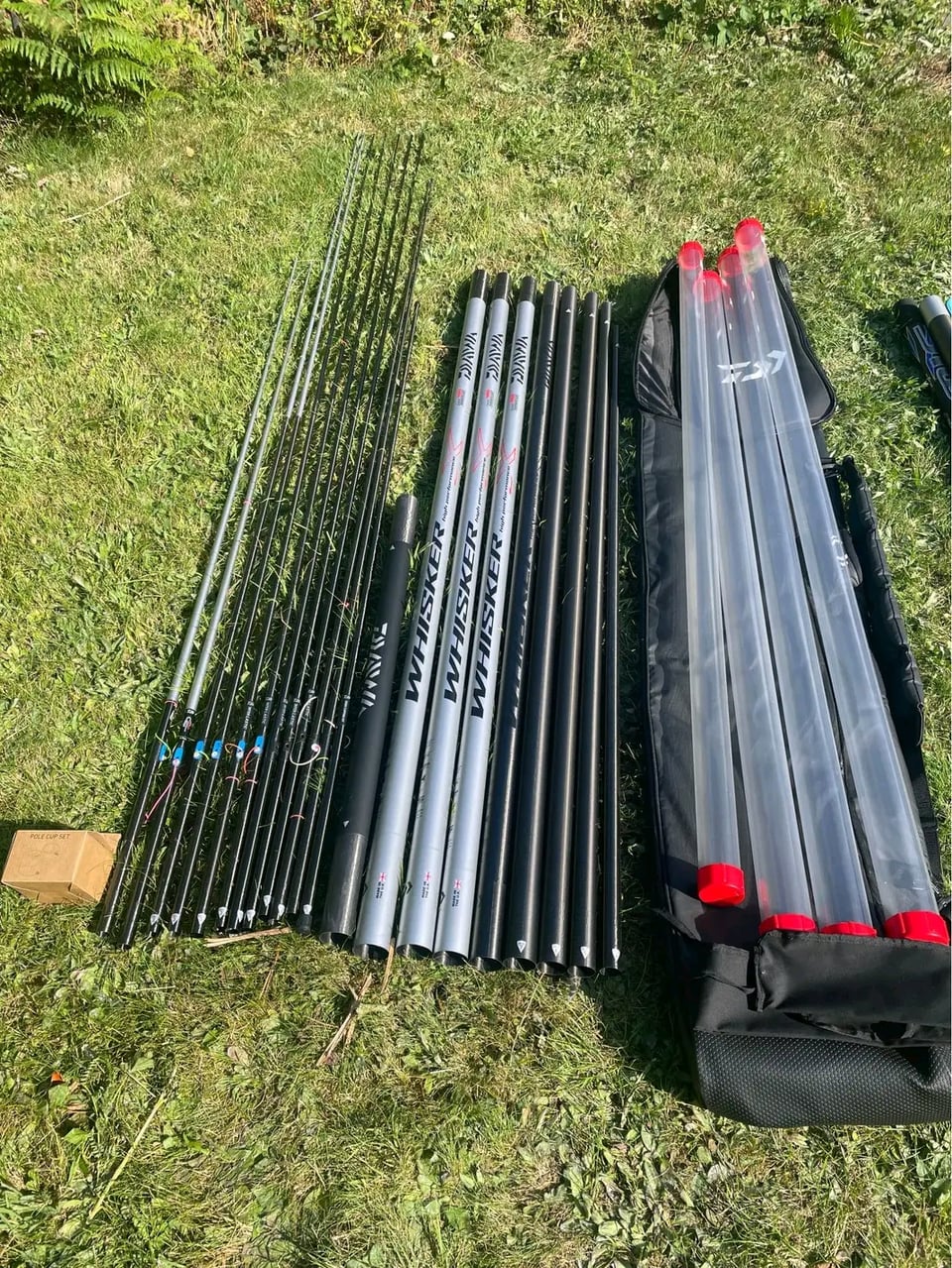 Daiwa whisker x 16m pole package,no dinks or chips or repairs,very little use,comes with 5 4.2mm match kits,2x 5.8mm power kits(unused)…2x cloud short kits and 2x match kits which have been wrapped and fitted with Preston rolla pulla’s ,zoom cupping kit & cups (unused) includes phex 5,daiwa holdall