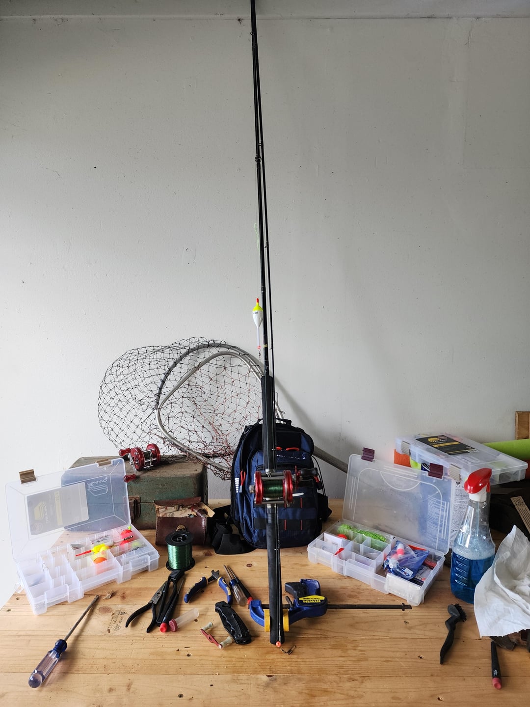 I took the entire week off work to fish. Today, I retied my entire crappie rig. It is a 10' 6" Uncle Buck's rod, the Abu 5000 reel is loaded with fresh 20# Berkley Big Game, the slip bobber is on 3' of 12# Big Game. I like green because it matches all of the lakes around me. The sinkers and hook are on 18" of clear 8# Suffix.