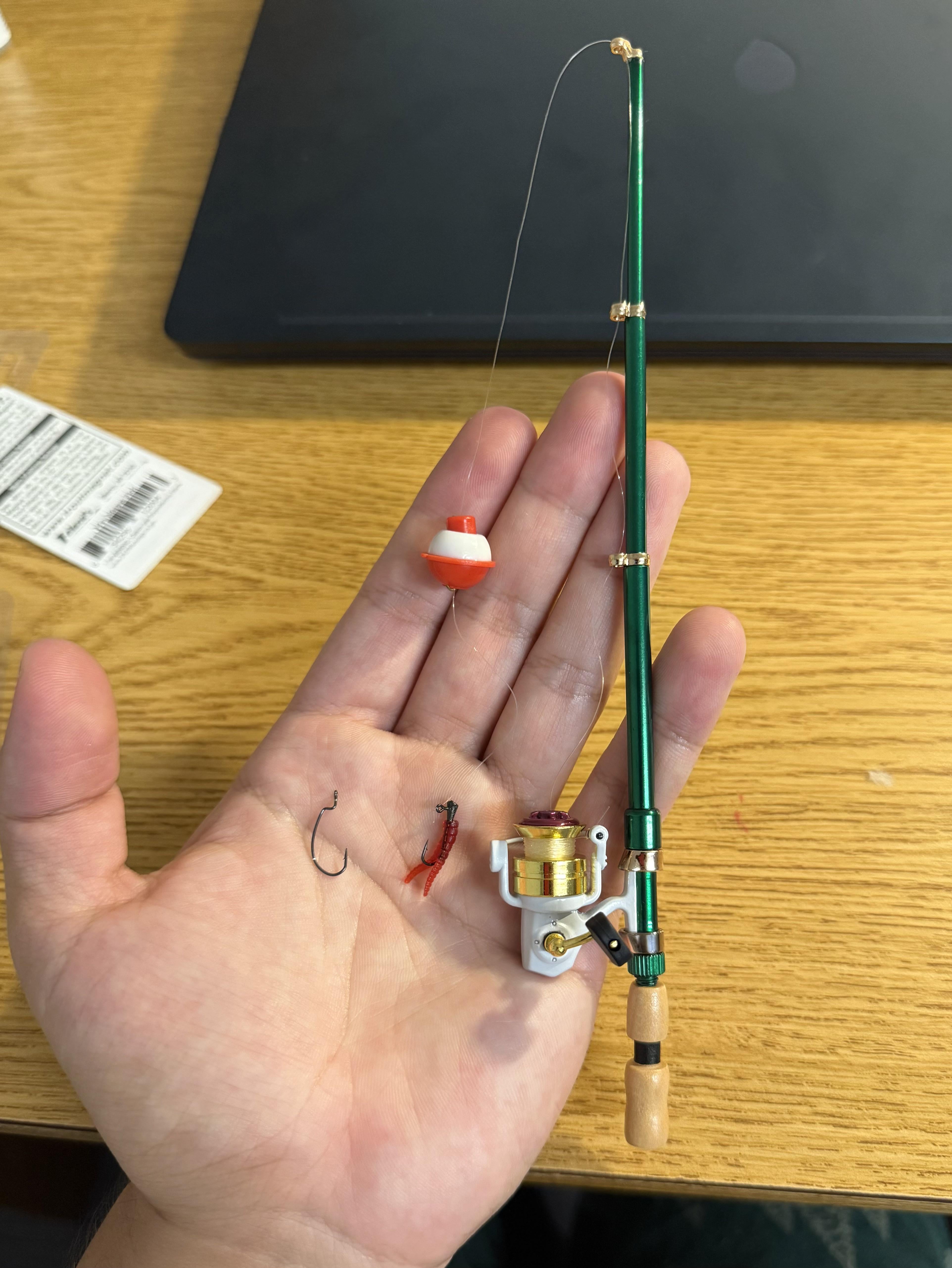 Mini trout magnet on a mini fishing rod I got from a gashapon capsule plus a random tiny ewg hook from aliexpress