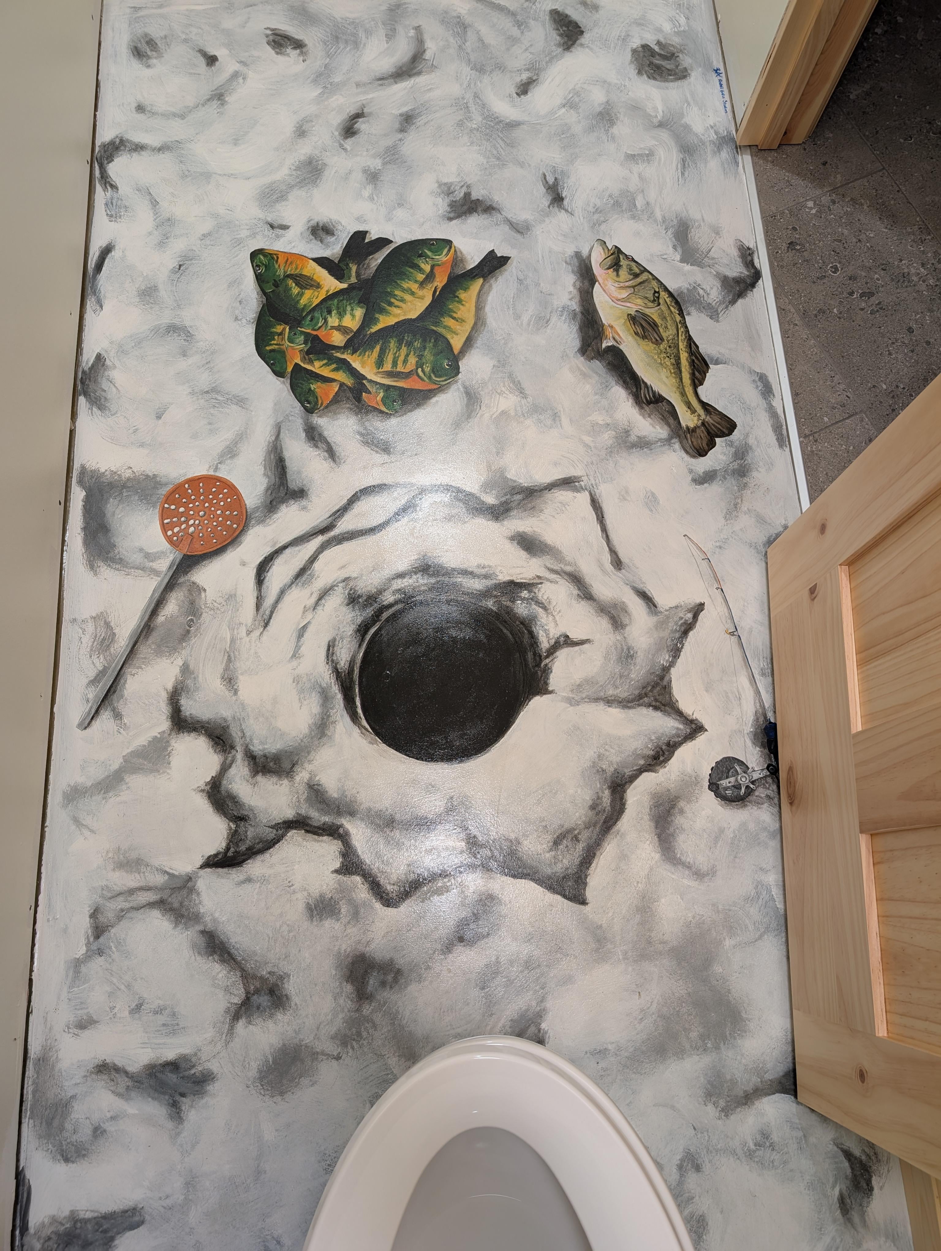 This is the floor in my father in law's new bathroom. I got the idea after seeing a similar bathroom years ago somewhere online. We're both avid ice fishermen and mainly target bluegill, hence the pile of gills in the painting. Not a bad place to take a bathroom break.