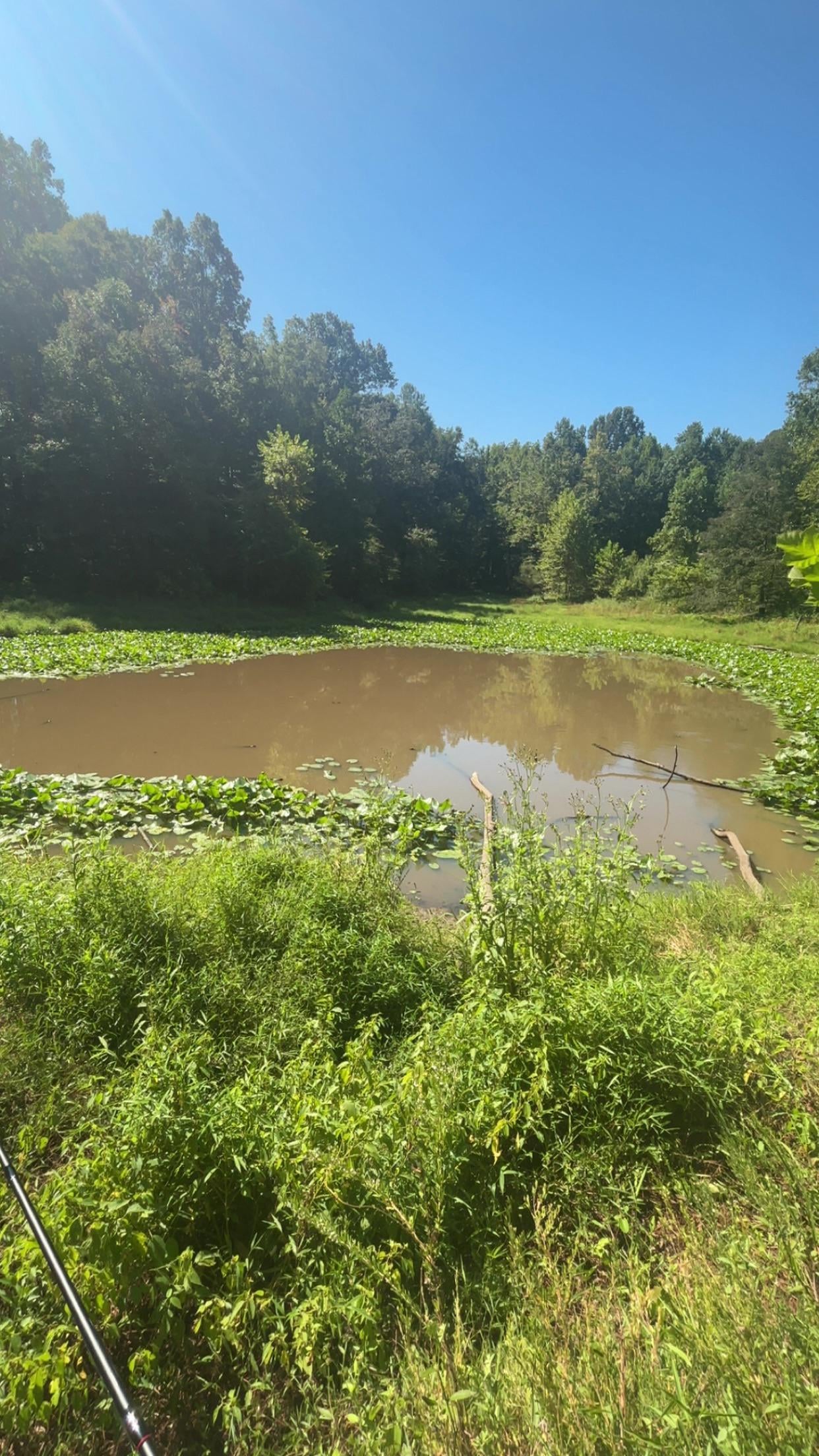 Old farm pond looks like it was used at one time but has since been taken over by the woods. Casted a spinner a couple times and got nothing. There were a ridiculous amount of frogs and swimming insects. I feel like if there were fish in here they have long passed but wanted yalls opinions.