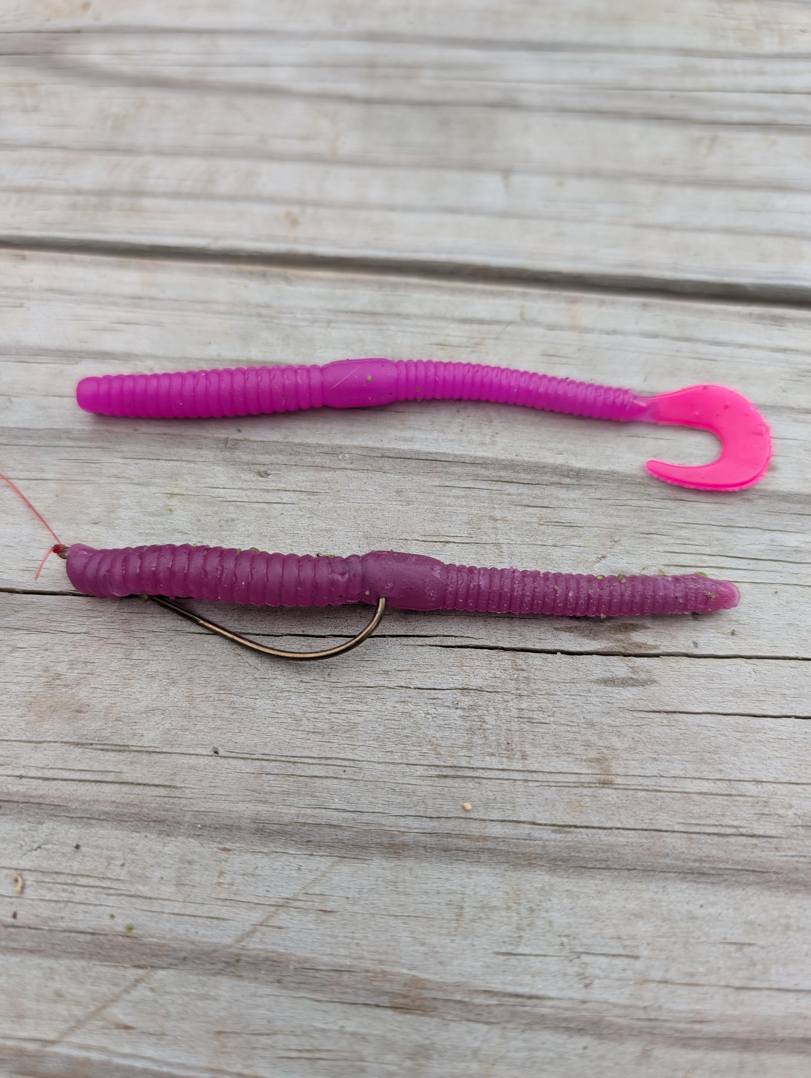 It was getting late, so I decided to try out my kayak for only the second time. All I took was the small pink worm pictured with no weight. I paddled to a different part of the pond, and I'm not exaggerating,