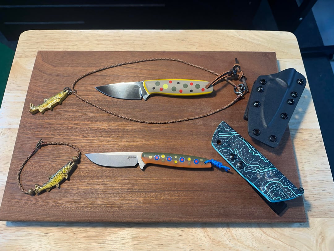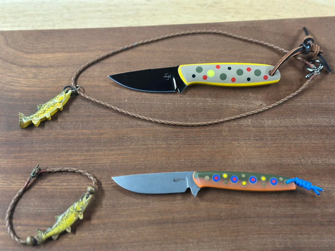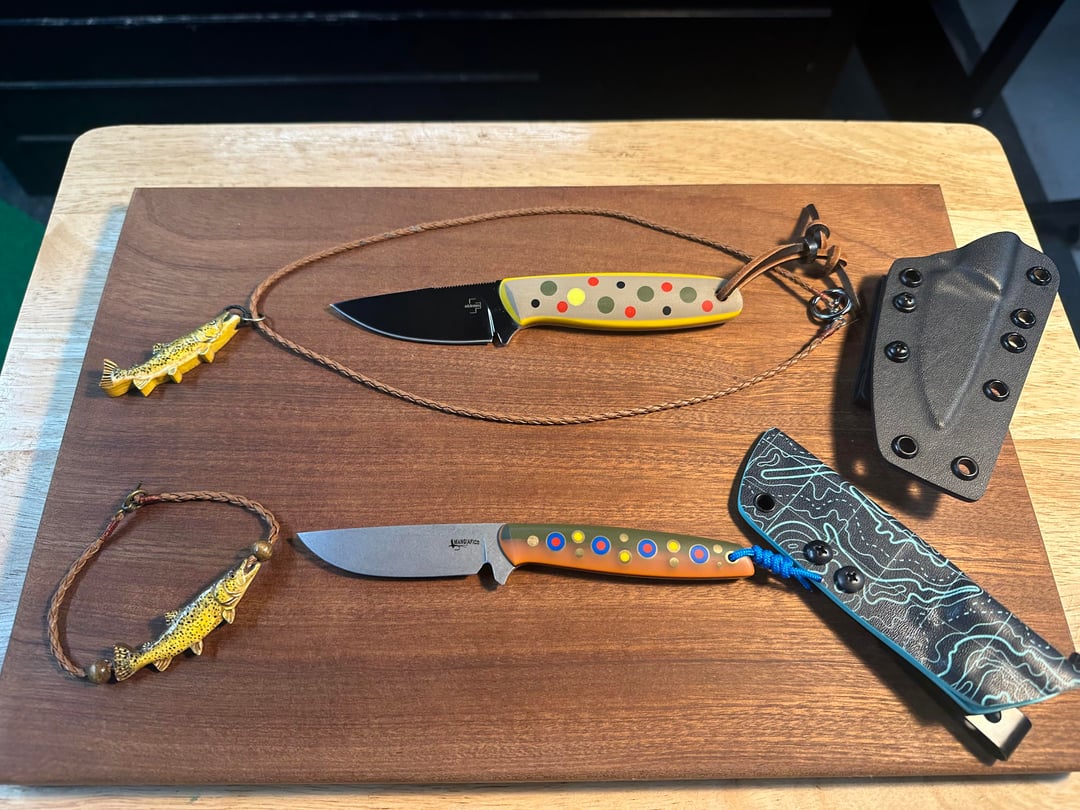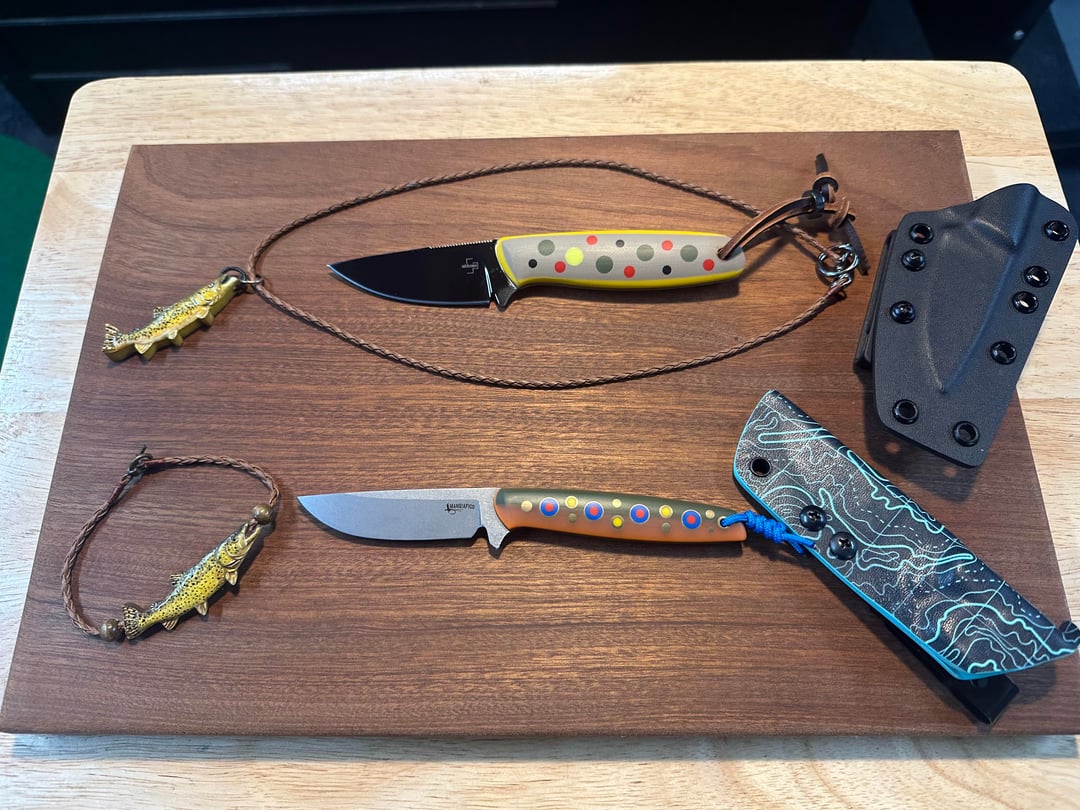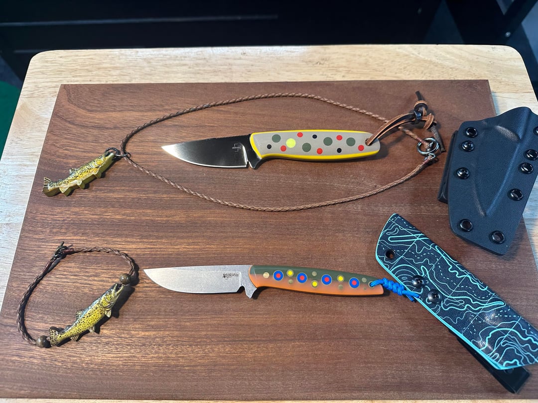 Both are Designed by Joe Mangiafico. Top brown trout made by Boker knives (design by Mangiafico) and Brookie was custom hand design by Joe Mangiafico Bladesmith to our trout fishing community. I tried to take pics with lighting moved around but it does not do the artwork justice. Great pieces and extremely happy to now have these both in my collection. Thanks Joe!