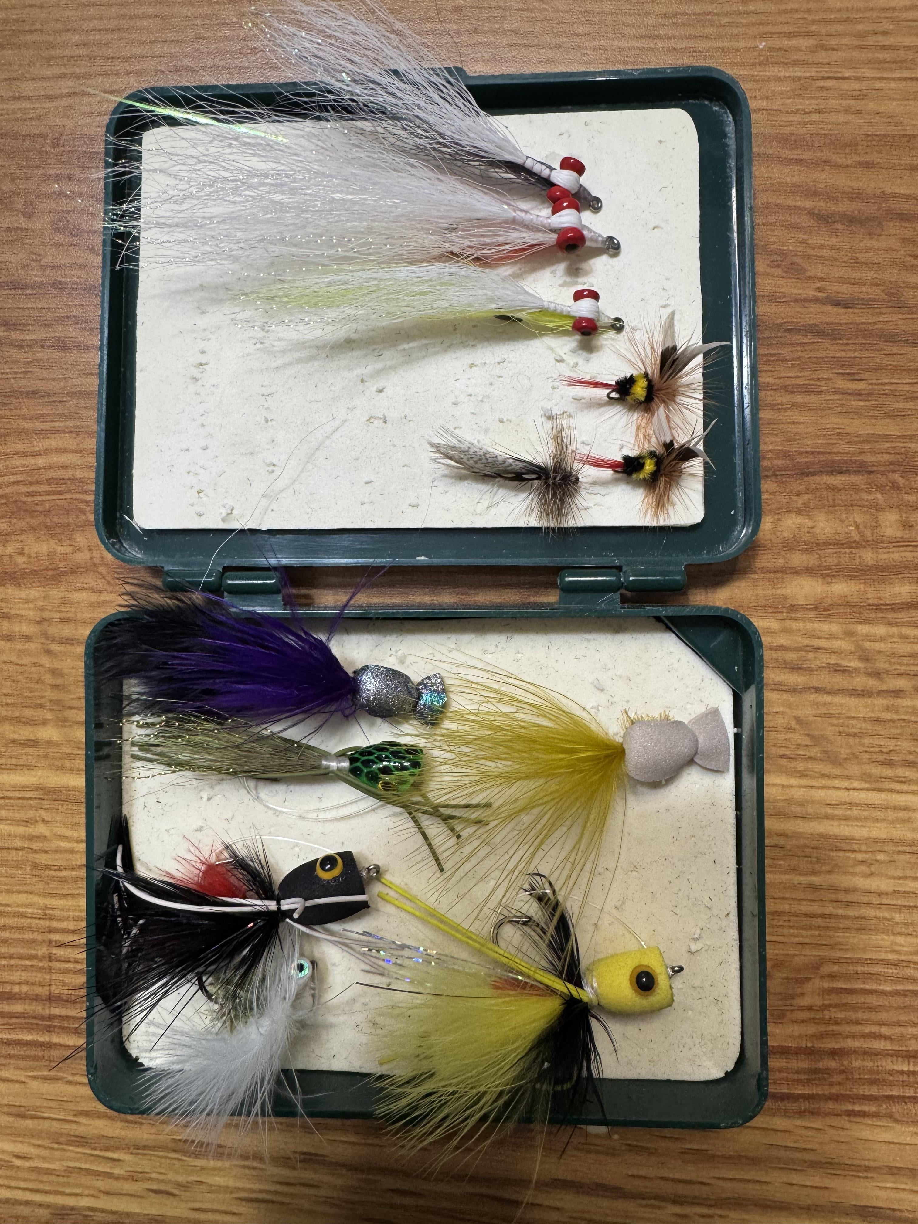 I’m pretty new to fly fishing, and an old-timer in my neighborhood was getting rid of a bunch of his hand tied flies. He put together a dozen or so flies for me. I realized after I got home that I don’t actually know what to do with these. I told him I’m planning to fish for smallmouth bass in a few weeks, so assume these were selected with that in mind.