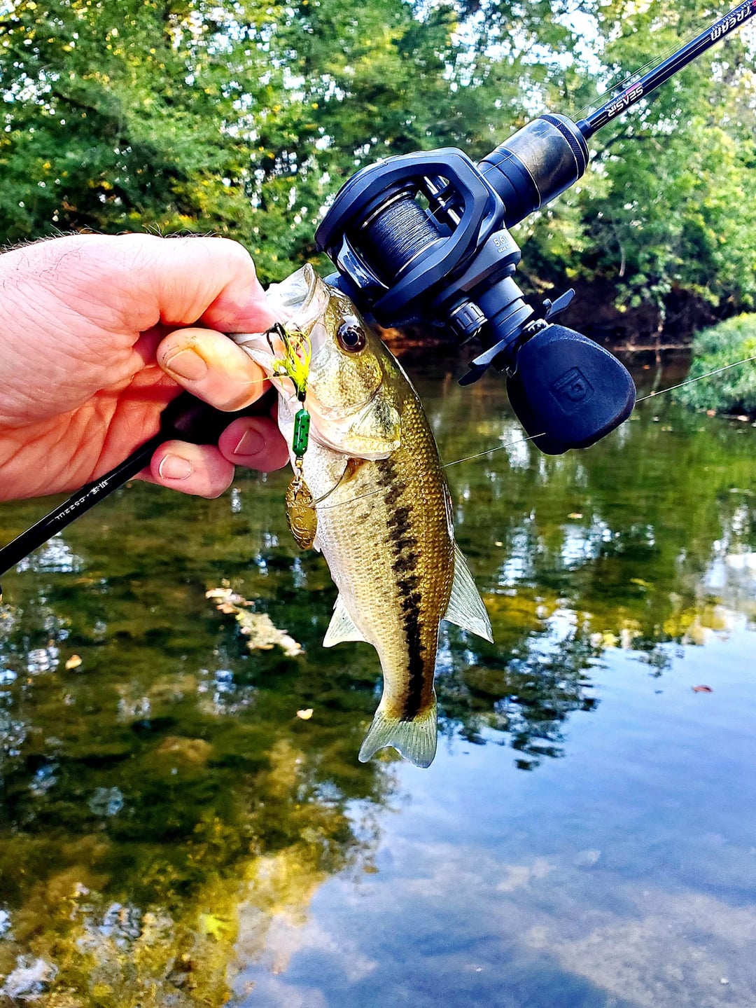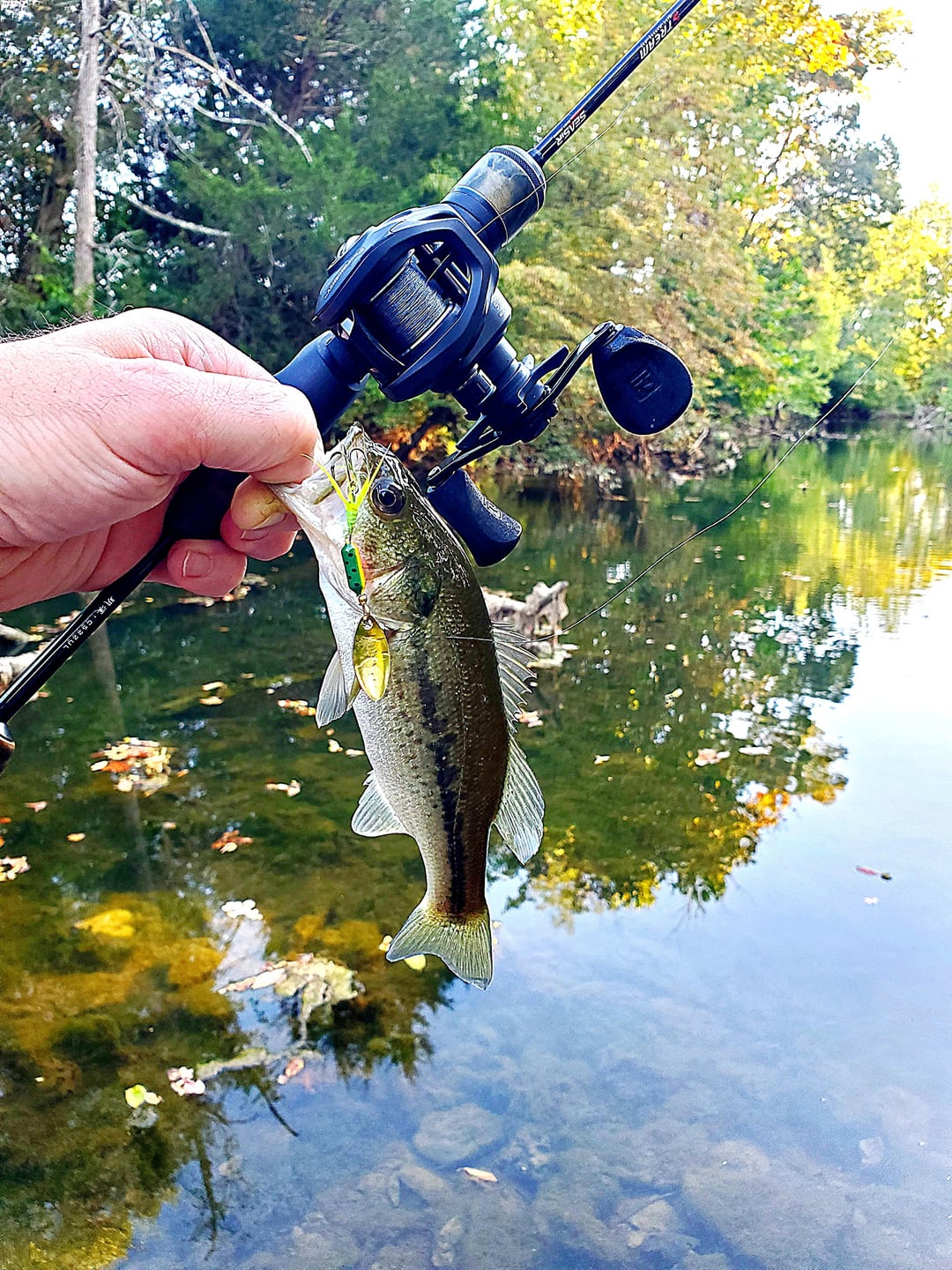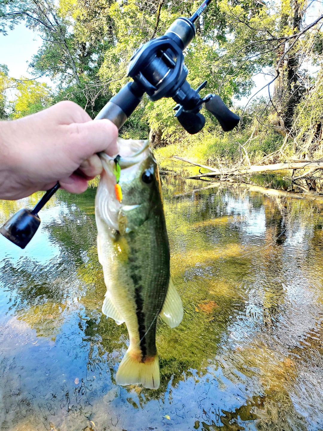 Got out for some wet wading after work today. Traveled upstream a couple miles on my favorite creek with just my ultralight stream rig and a 1/16oz fire tiger rooster tail. Pulled a fish on just about every hole, usually on the first or second cast. Caught my first creek chub too but the little bastard didn't appreciate the photo op and shook off the hook while I was reaching for my phone. Those bass sure can bend this little rod!