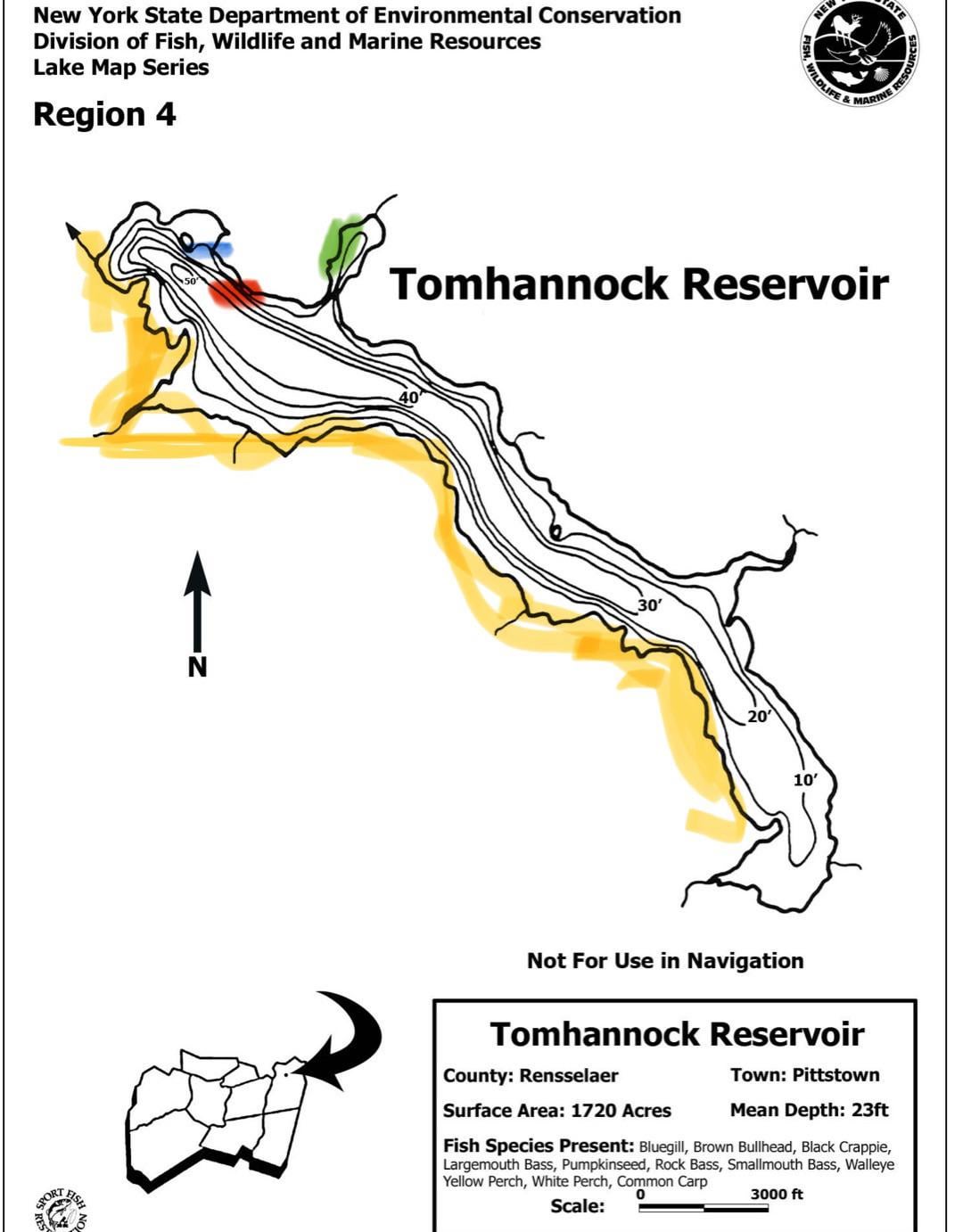 For the last month and a half I’ve been hitting a bay with lots of vegetation all the way at the end (marked in green) at the crack of dawn 1–2 times each weekend, fishing for around 6 hours each trip. The results have been super consistent — every time I catch 1–3 carp between 8–12 lbs, but nothing bigger or smaller. I fish outside of the weeds. I also tried an open-water spot right off shore that’s very deep (marked in red on the map) for the first time today seeking bigger fish, but got no bites. There’s also another bay I’ve noticed that’s around 10 ft deep right off shore, but I haven’t tried that yet. (Marked in blue on the map) The entire left side is pretty much off limits as people own property except for one part near the bottom where that bottom 10 foot marker is. (Marked yellow) I know the spots I’ve tried look close together but it’s not this water is huge.