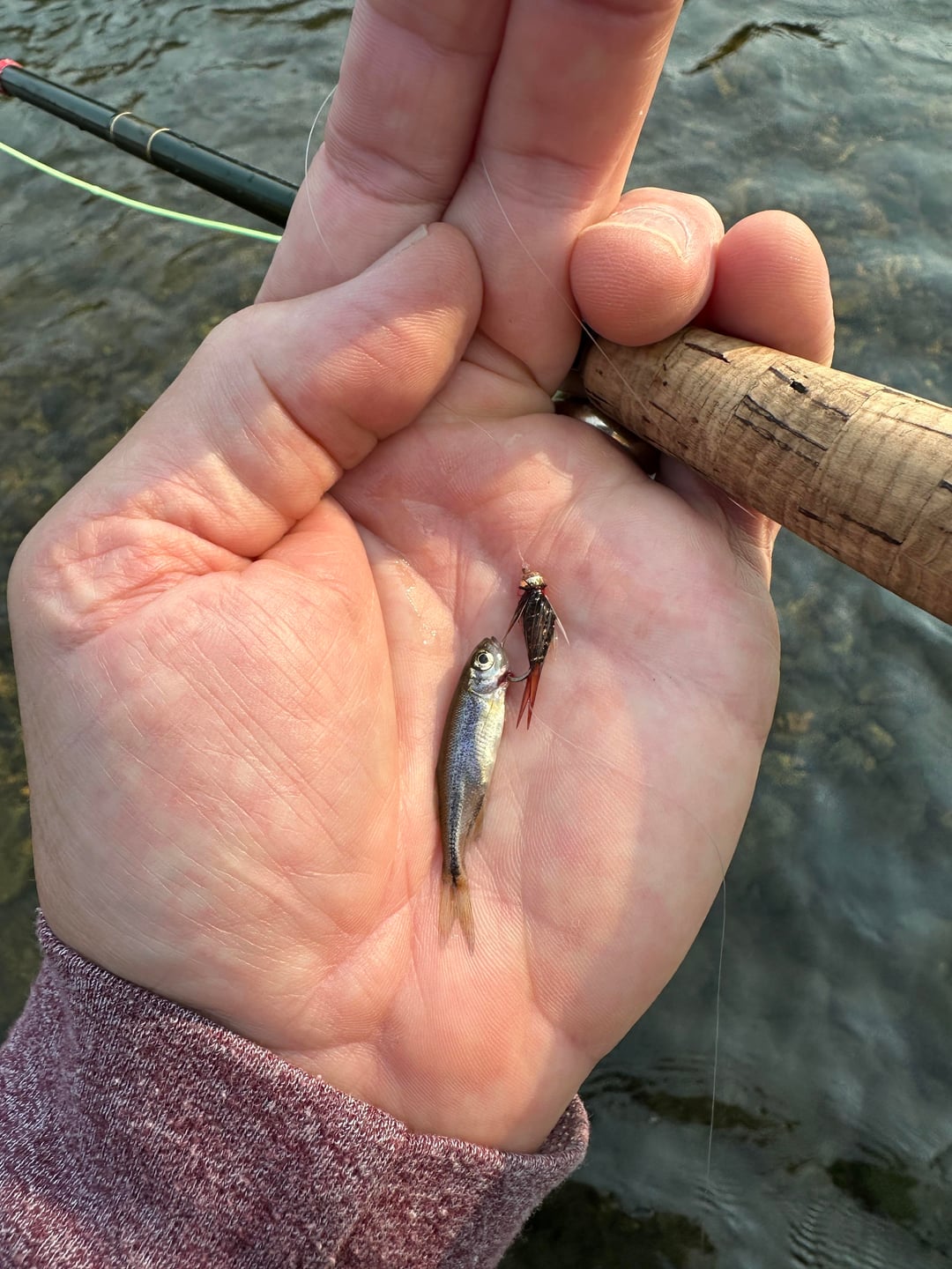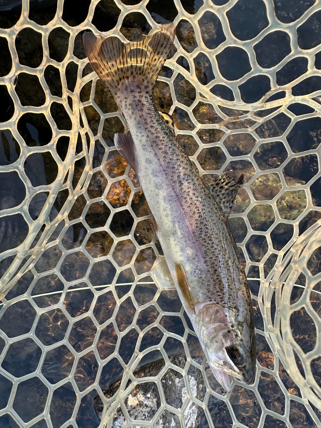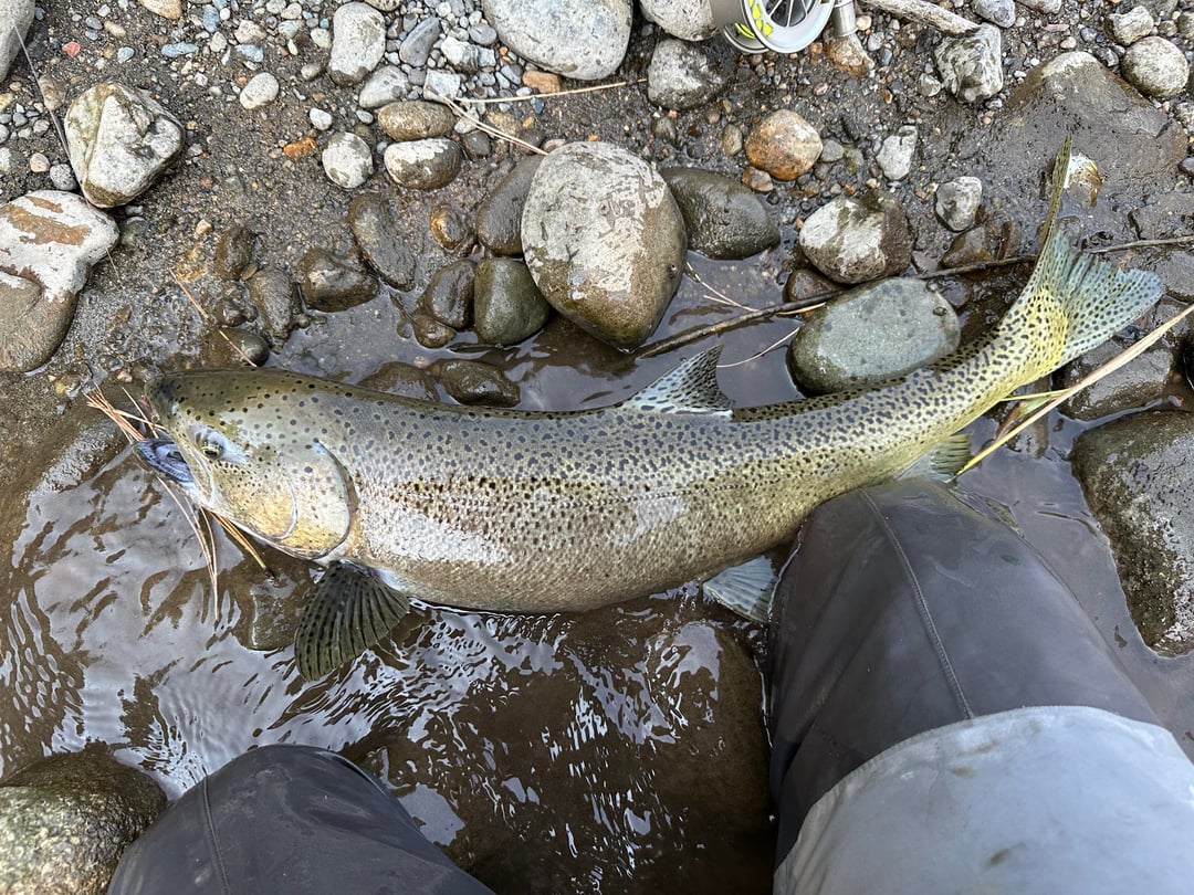 Hooked fair in the upper jaw (fly is visible in pic) and the take felt just like a big trout. There was no way this one was going to fit in my net, but I beached and released him as gently as possible.