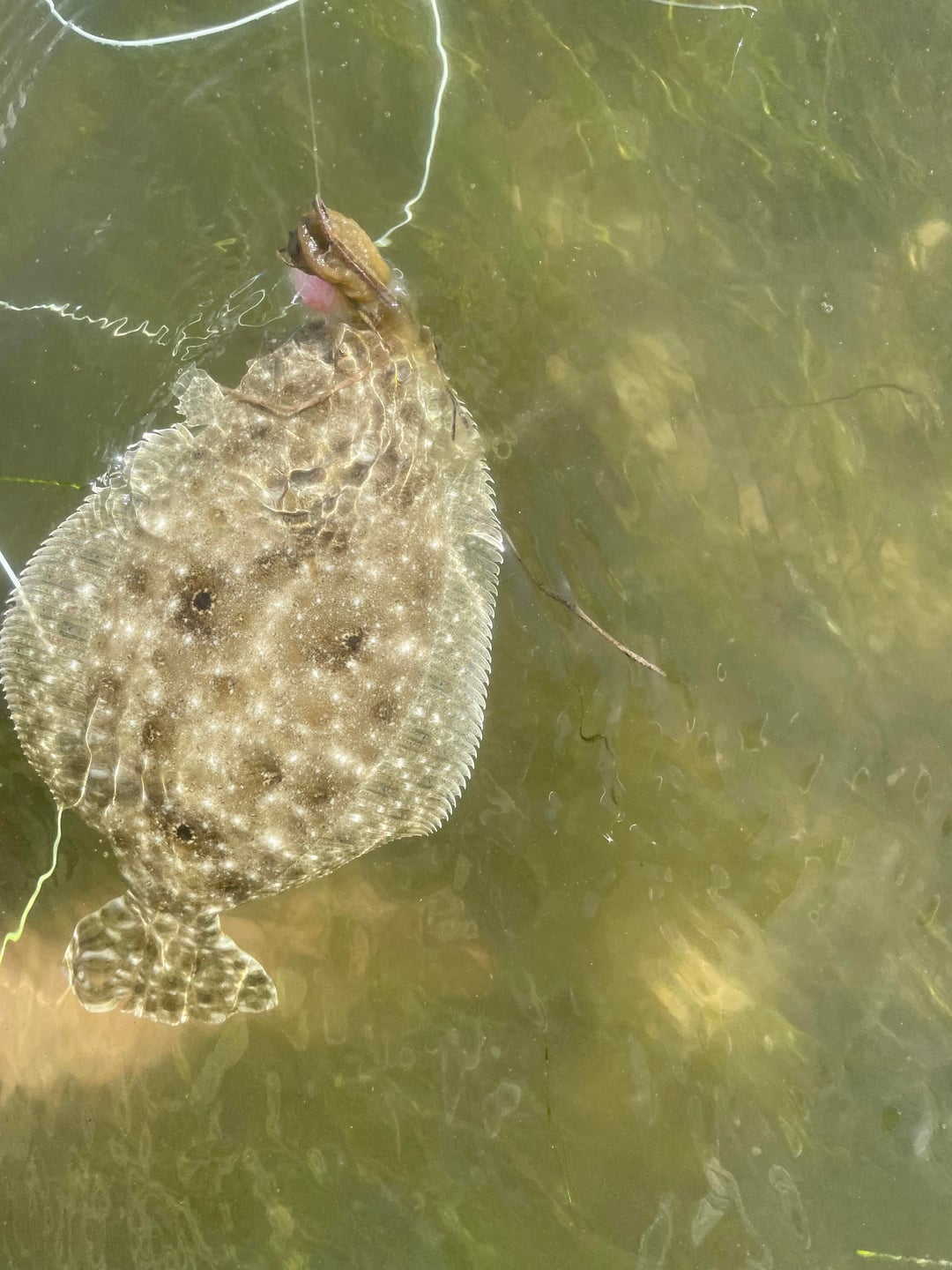 Spooked a couple snook on a flat on the gulf side of FL, but tricked a bunch of little flounder with this improvised shrimp pattern, just some EP brush, dumbbell eyes, and crystal flash -lot of fun, but the 8wt was way overkill for these little fish