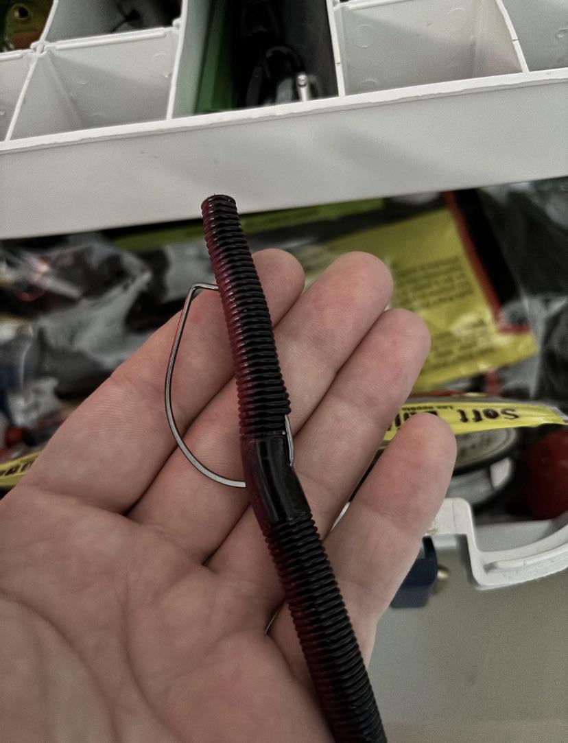 Tie the hook on first, then when you rig your worm push it up over the eye of the hook. You’ve fed the worm up your hook too much, with the eye covered you won’t be able to tie on