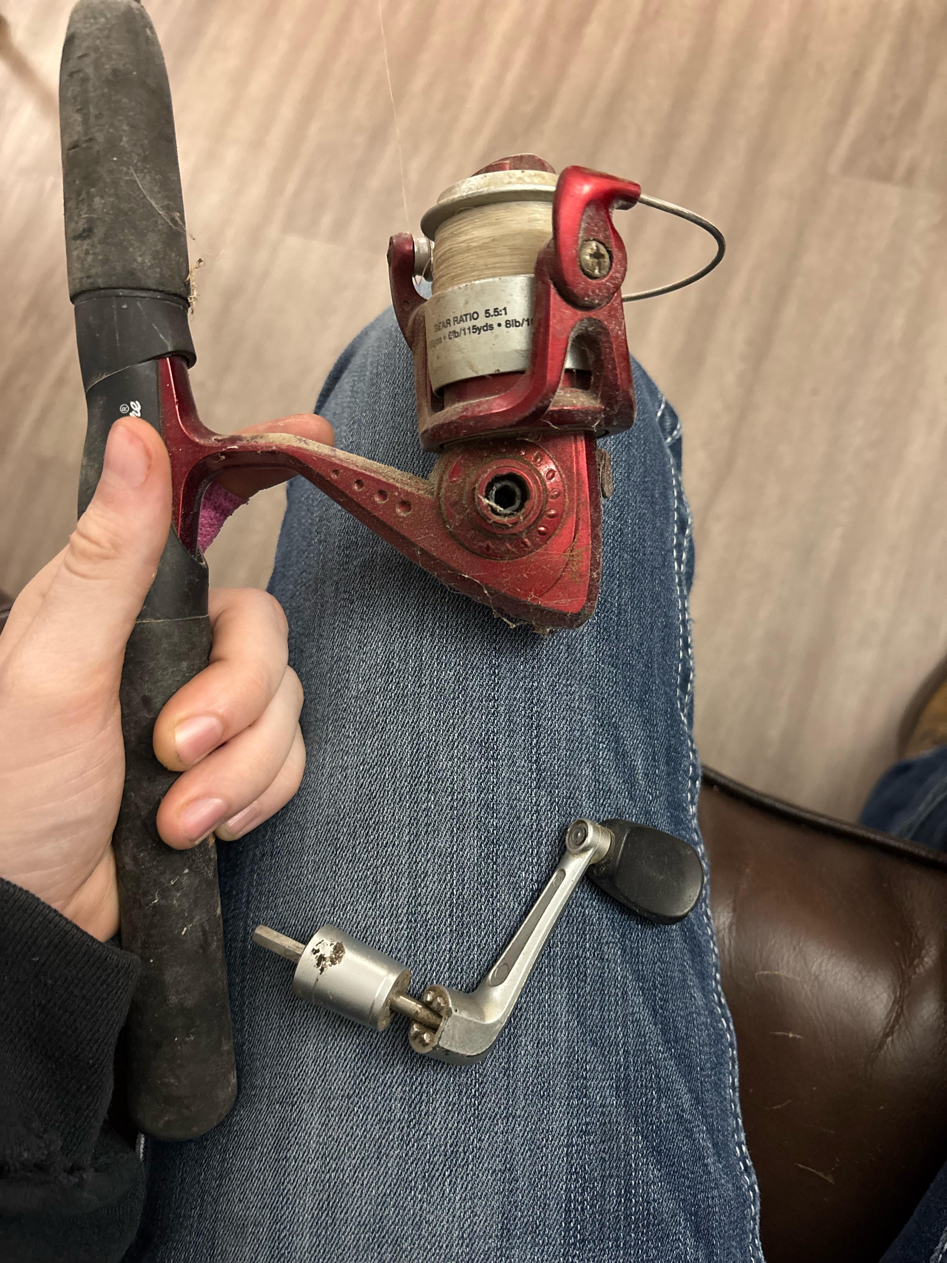I’ll attach a picture. My friend wants to go fishing with me, but she’s a lefty so I dug out my old spinning reel I haven’t touched in years and found it’s broken. The handle came out. Does anyone know how I can fix it? I tried twisting it back on, but it didn’t work. It looks like it could be missing a piece but I’m not sure.