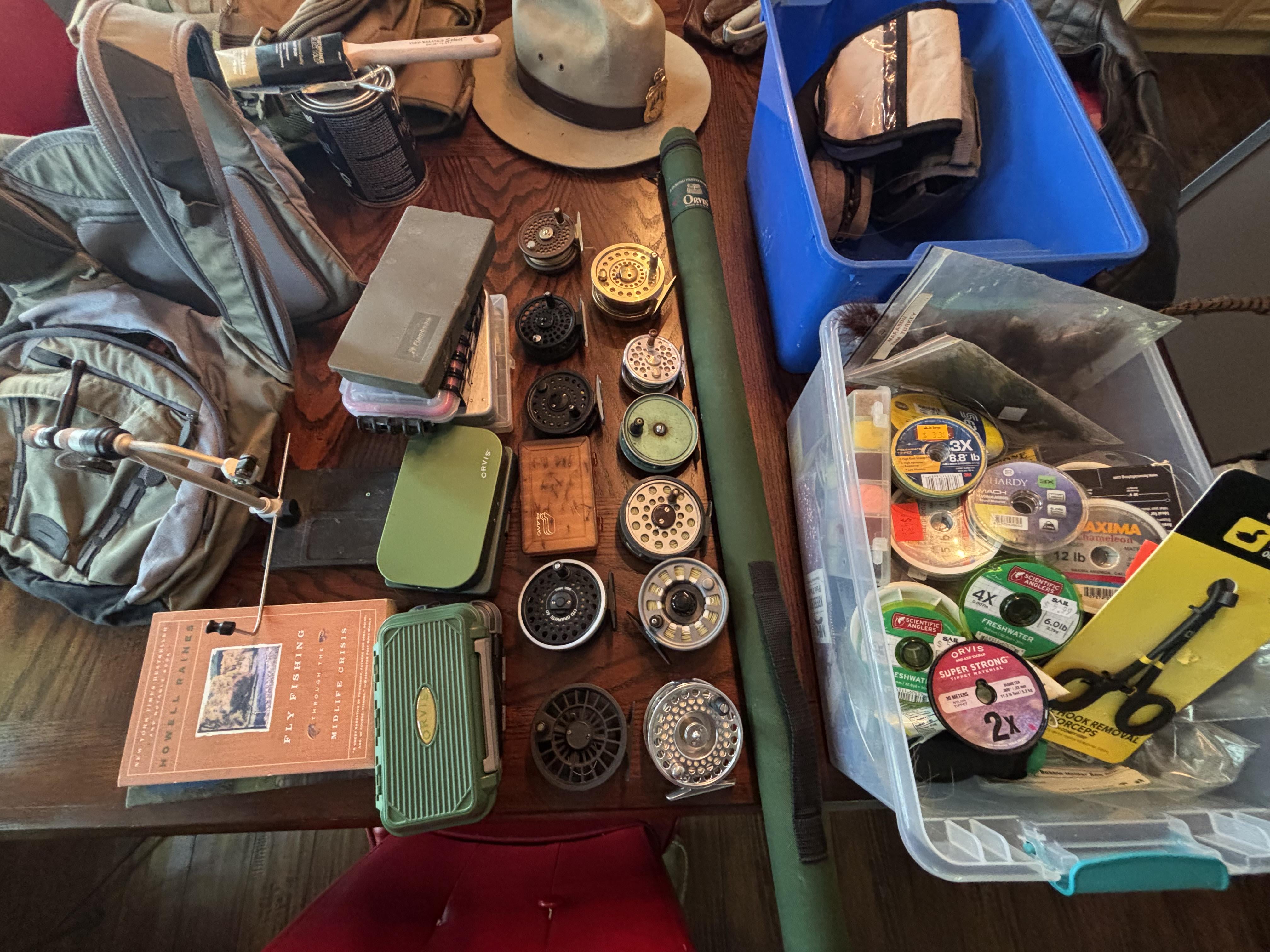 Some good stuff in there, I see an orvis CFO (appears to be disc drag version) and what appears to be a green JW Young Condex, which if that is the case is probably the most interesting thing in the photo (young was a British maker that made some high quality but affordable workhorse reels. I have a few and love the green ones). The vise is a renzetti traveler and is top notch.