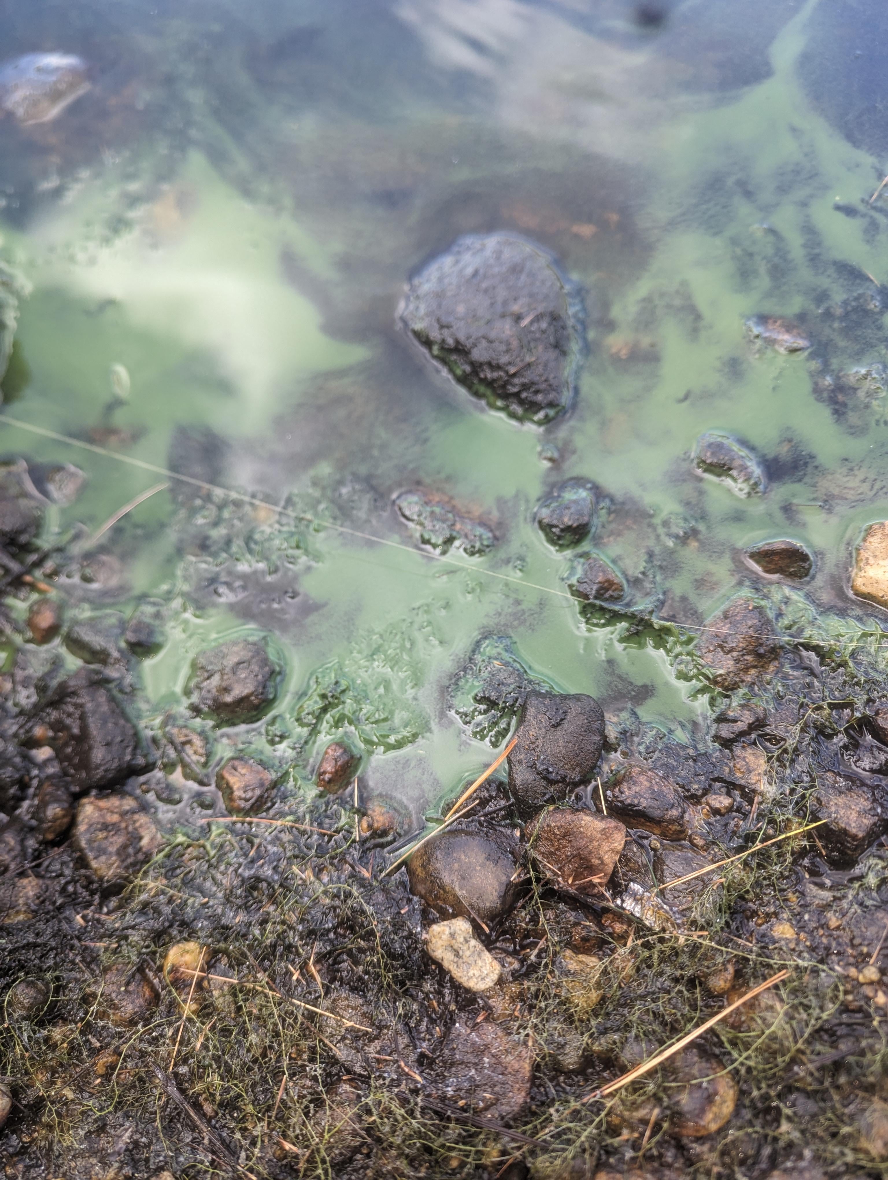 This (I'm assuming) algae seems to have pooled/grown along this one bank of a pond I'm fishing at. Doesn't extend far into the water and I didn't see it along another part of the bank I fished. This pond is part of my city's water supply, of that info makes a difference