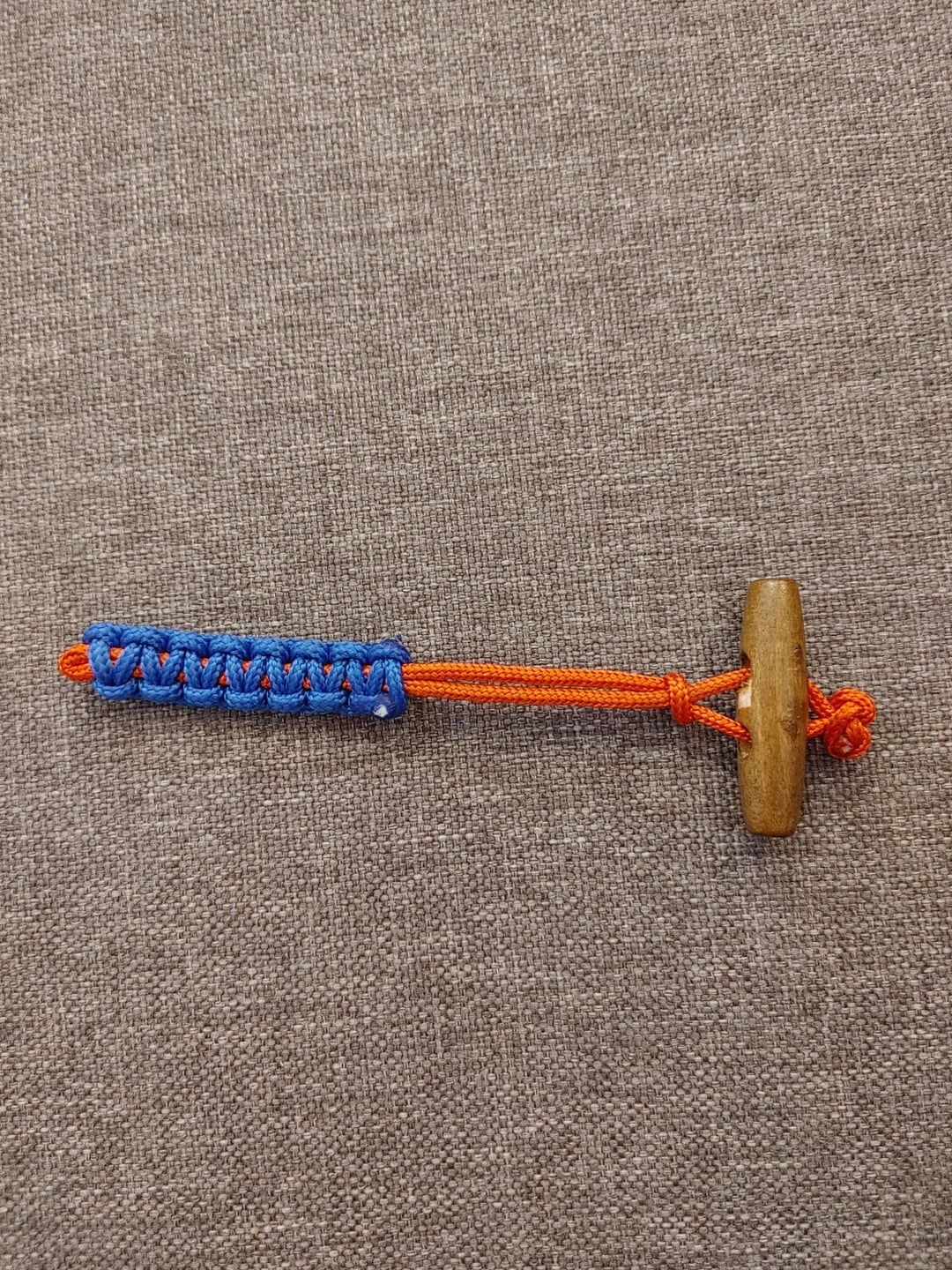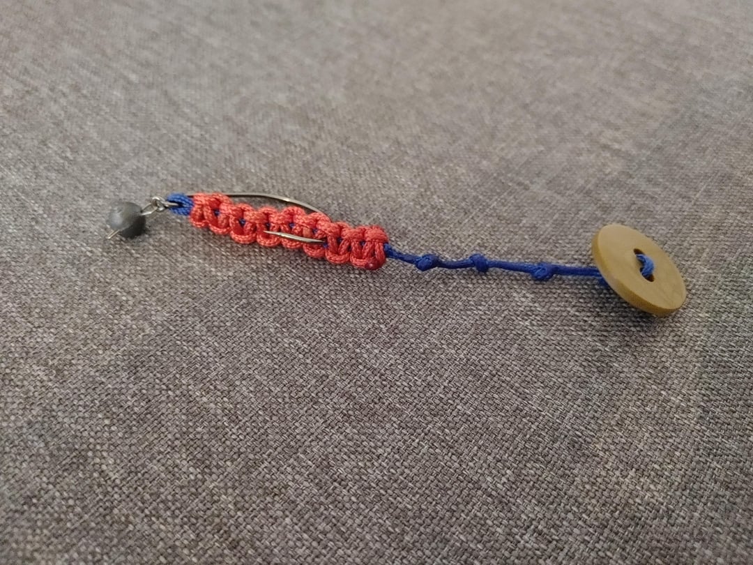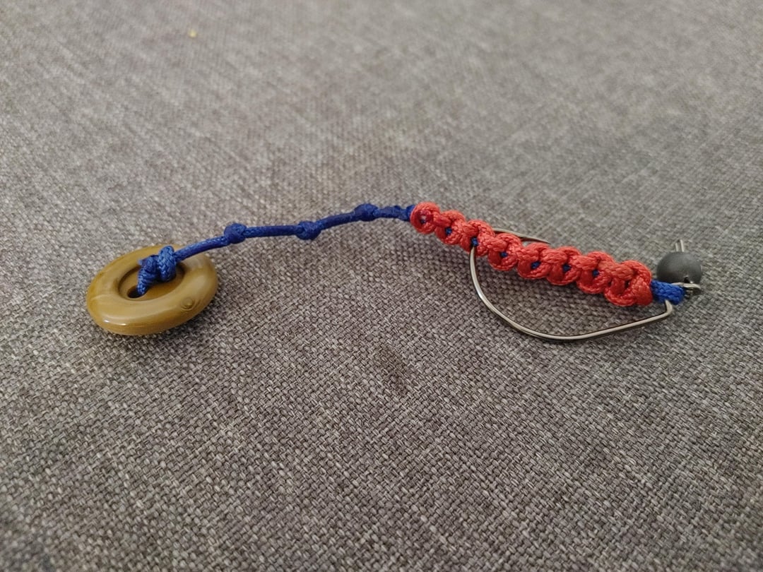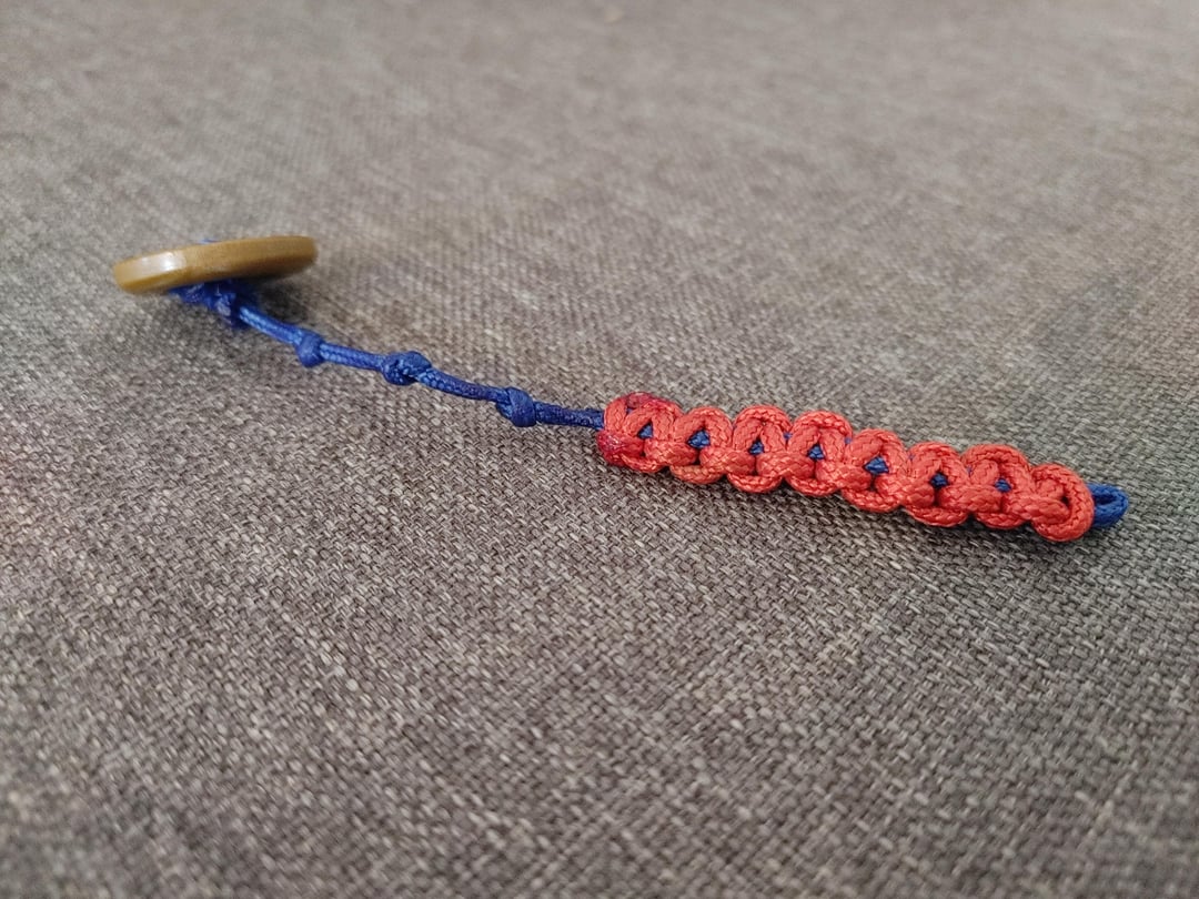 2. Switched to a button, 1 hollow paracord strand tail with knots: got a slight wobble at the tail, better but still weak.