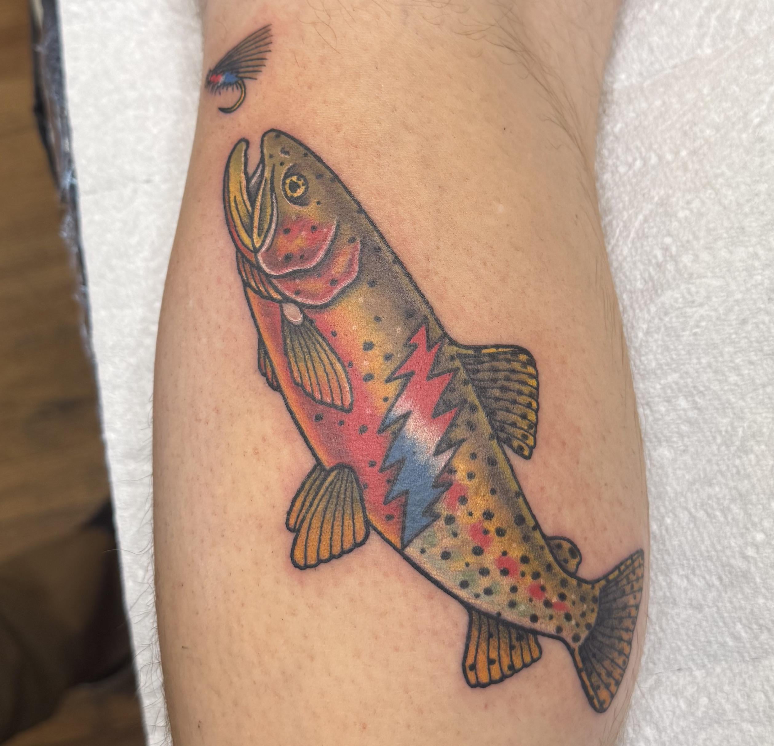 I have a rainbow trout tattoo with a dancing bear in the clouds behind it haha love this!!