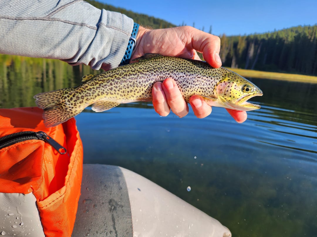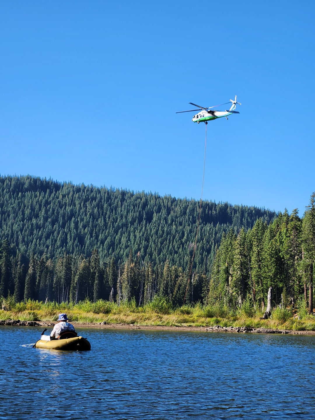 Had some interesting company yesterday in the Cascades. A couple helicopters did about a dozen bucket runs from the lake we were fishing. It's quite a sight to see up close (though not too close – we steered clear of the area they were filling from). The rotor wash was intense, even at a distance. The fish didn't seem to mind and we were able to net a bunch of cutties and brookies, with a couple rainbow here and there.