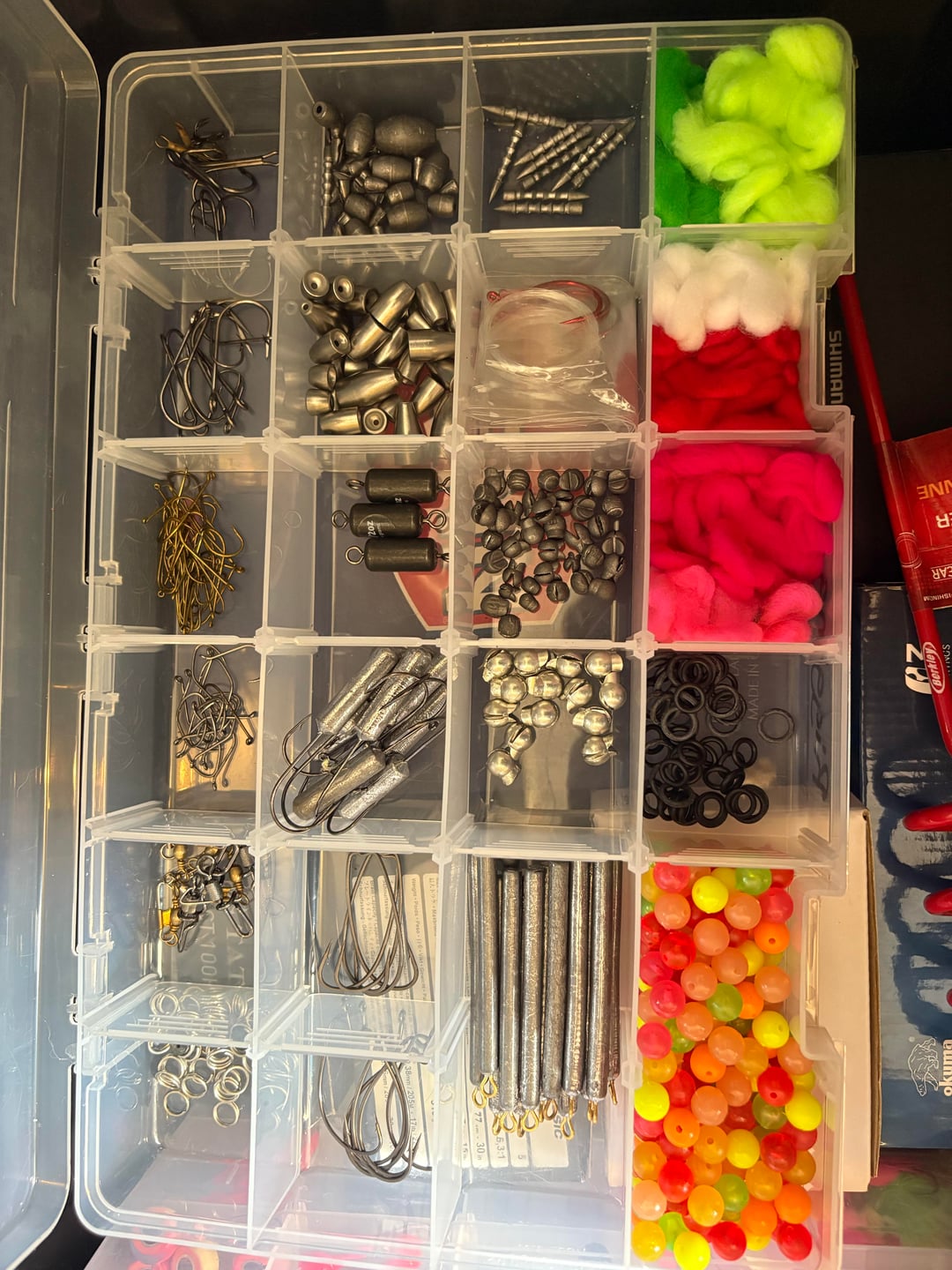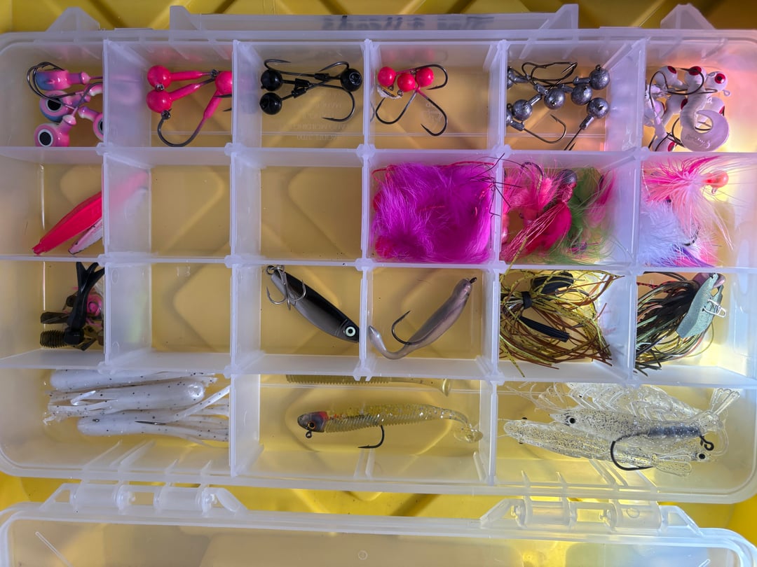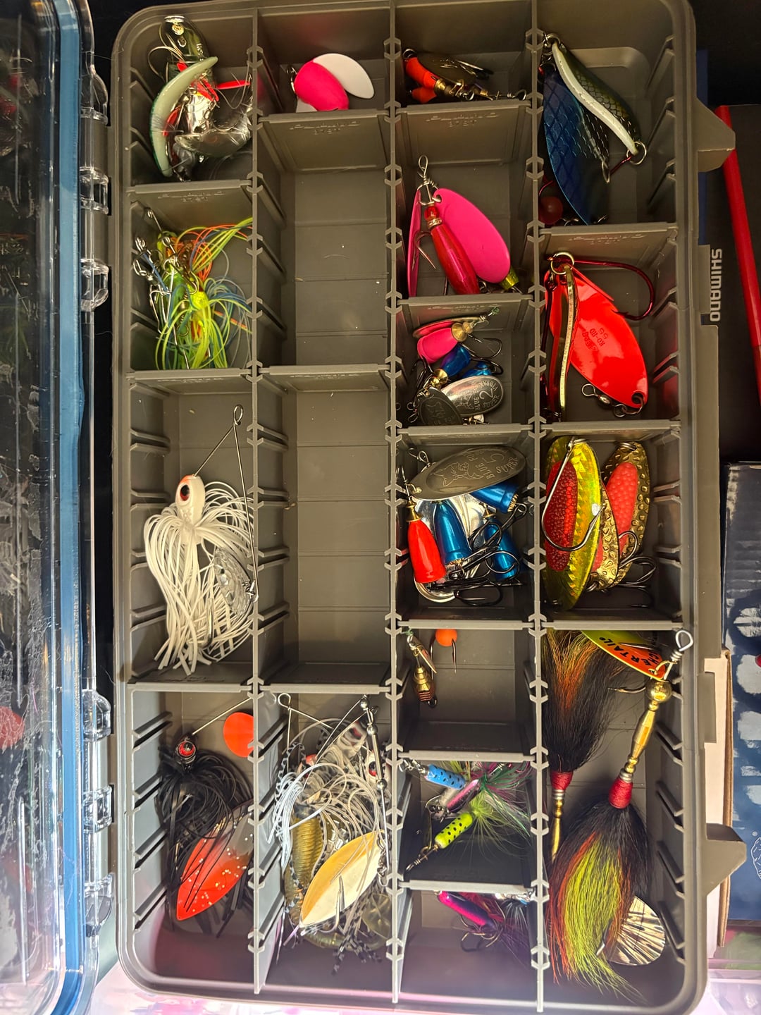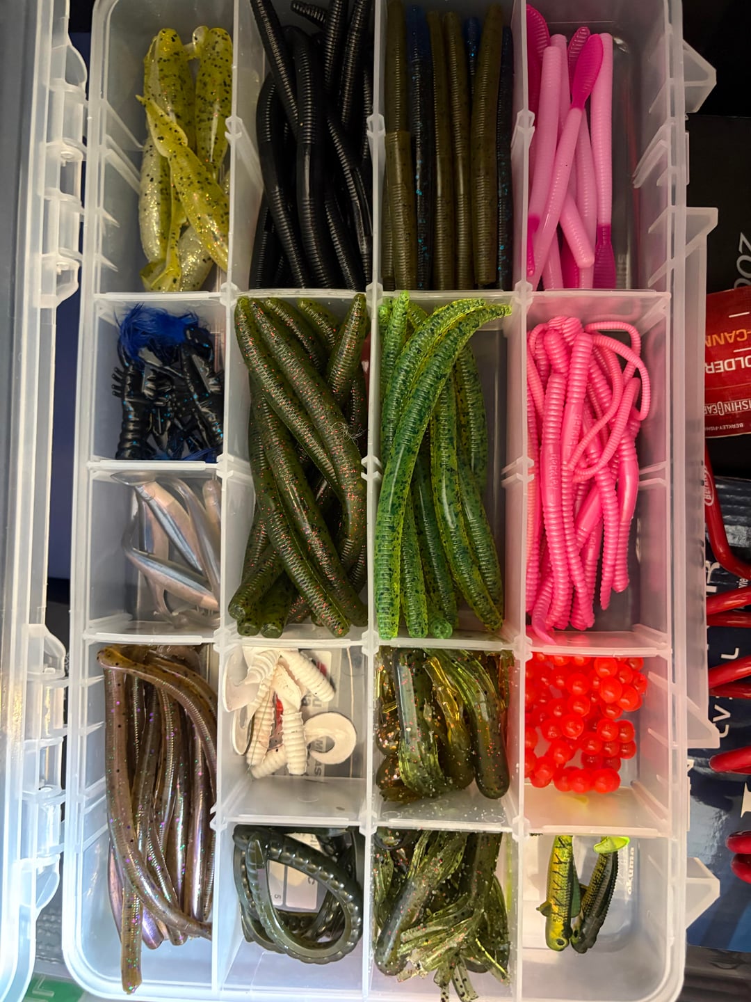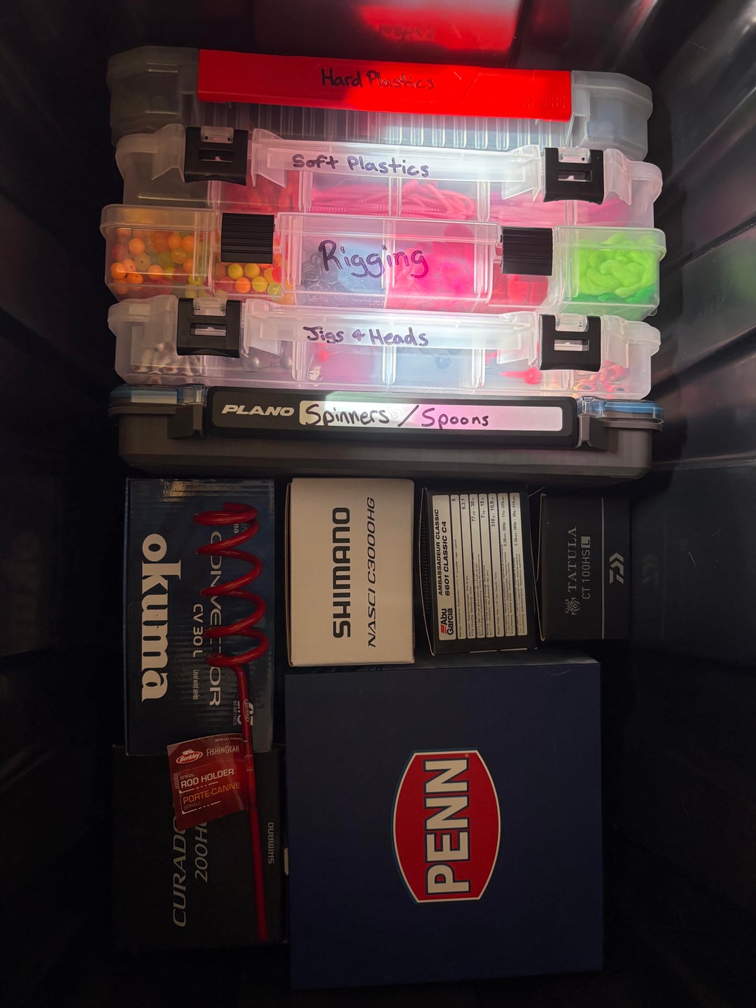 All my rigging, jigs, soft baits, hard plastic lures, and spinners are organized so I can make a custom kit for any outing.