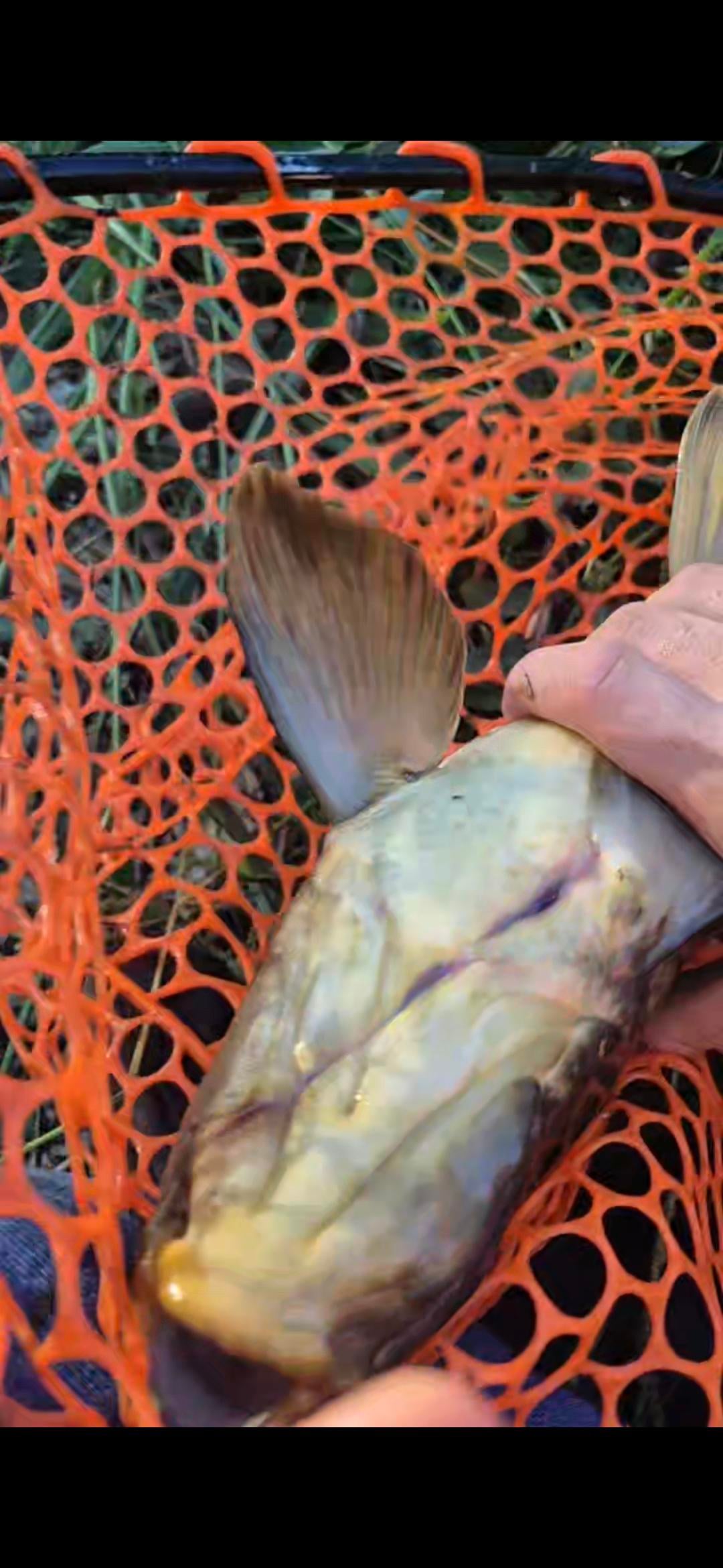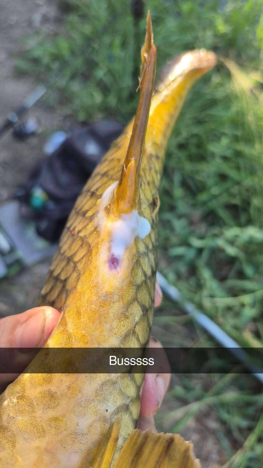 This guy had got hooked by some sort of odd 3 way rig when he was probably a year or two younger and even tho the hook rusted out the line remained and his front fin grew around it and so did his mouth. There was also a clump of roots in his mouth slightly obstructing his feeding. Couldn't find any hooks but I cut the line out and set him free. Bonus milt photo from the same carp for you freaks