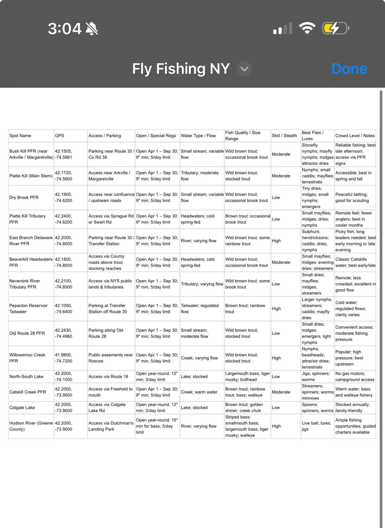 New to fly fishing and I'm heading over to the Catskills to explore some new spots to fish. Made list with some info on each spot but I'll most likely be Bush Kill PFR, Platte Kill or Dry Brook PFR. Its supposed to rain all week and planning on fishing Wednesday and Thursday. If any one has any advice on anything like what to expect or what flys would be a good fit to use, it would be greatly appreciated! Really excited, it's a shame that I'm really getting hooked to fly fishing so late in the season, which I started sooner. Check the list out, LMK if it's accurate or not. Love any feedback.