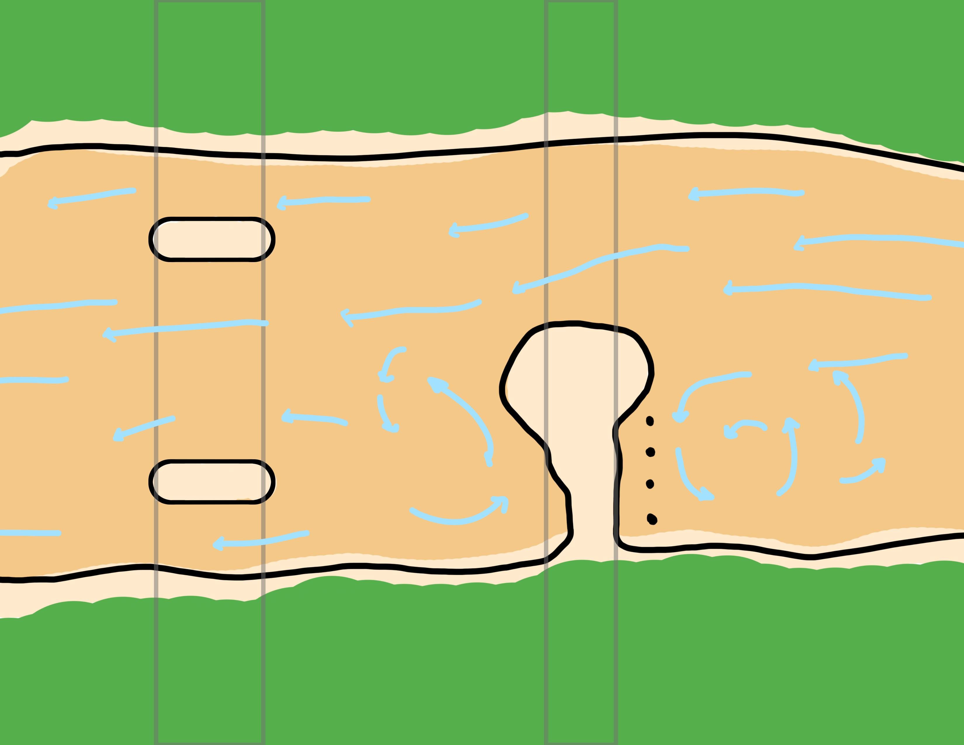 I tried to note the flow of the water. There are a couple of spots where the water swirls and sits at a faster or slower pace.