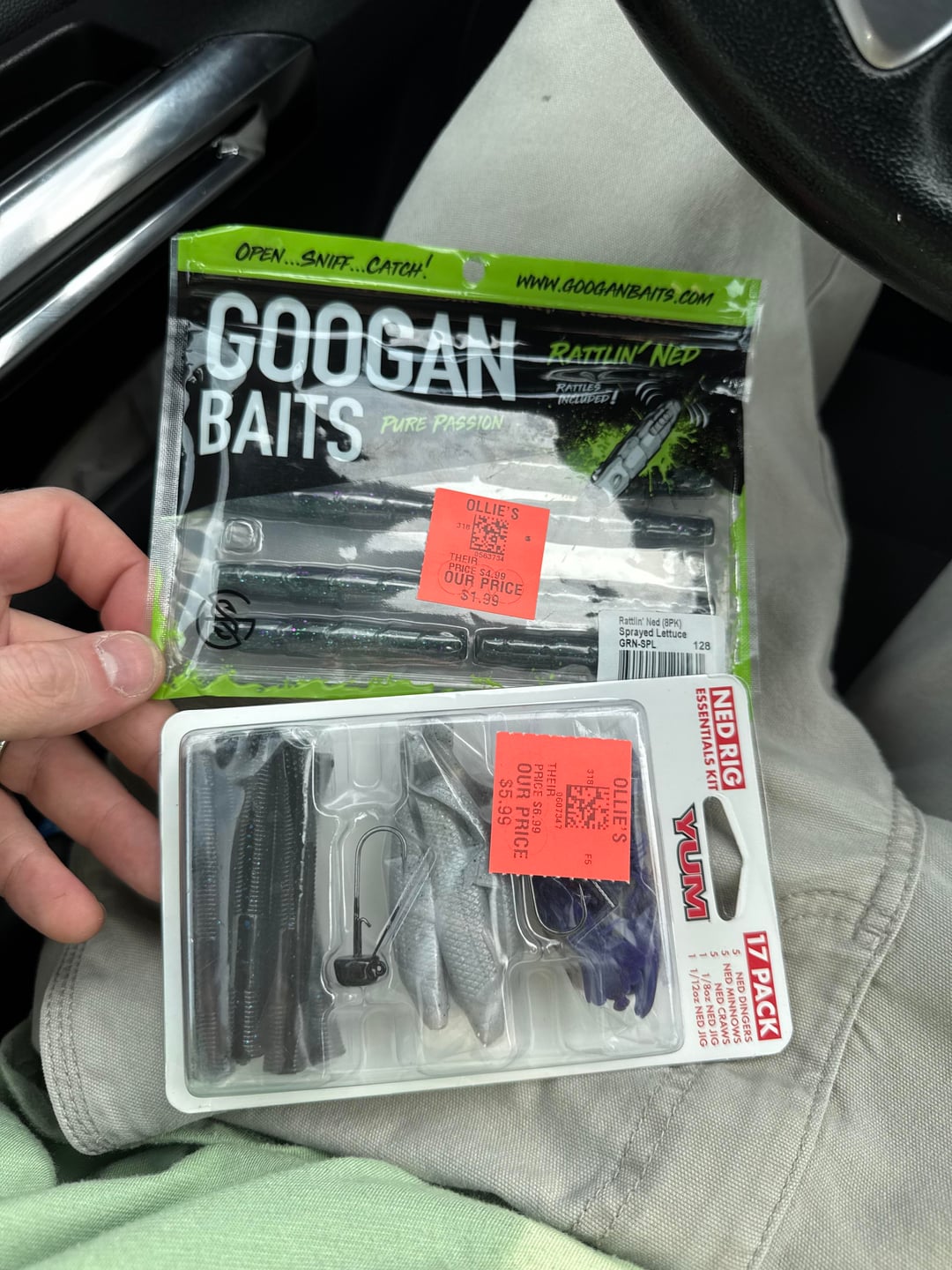 I recently came into some expendable income from a summons. I used the funds for fishing. I bought these at Ollie’s and proceeded to catch bass. Before this I’ve never used ned rigs. First hookup was with a wacky rigged ratting worm.