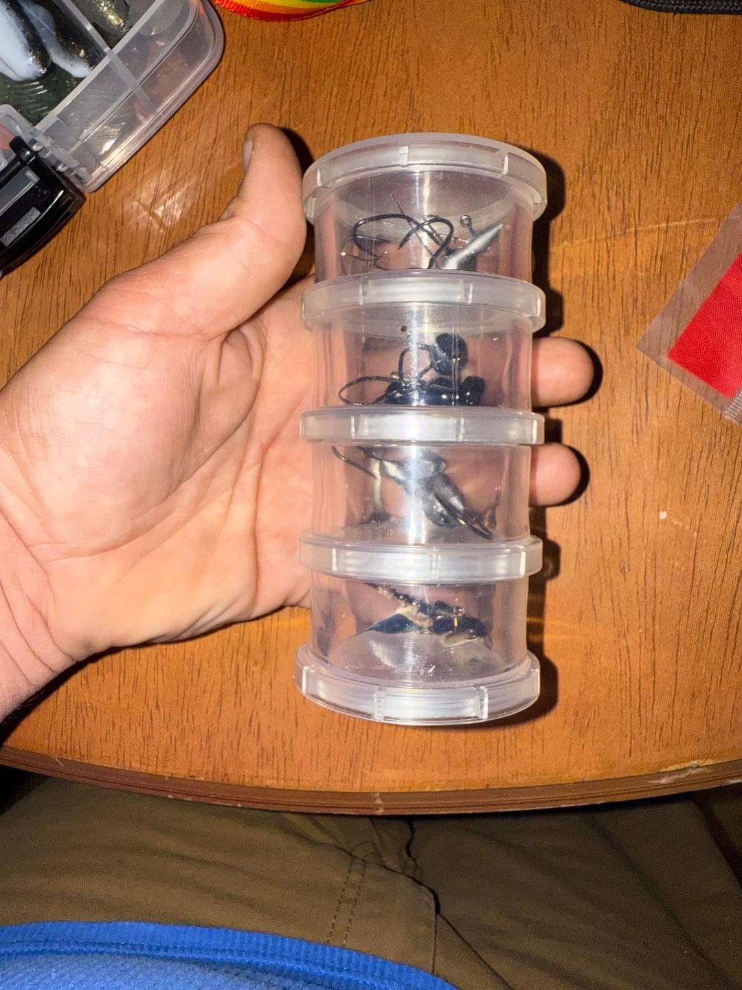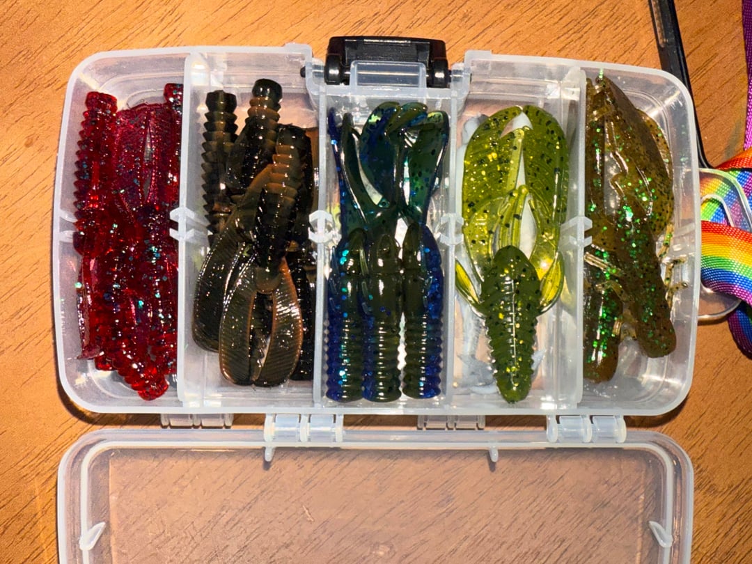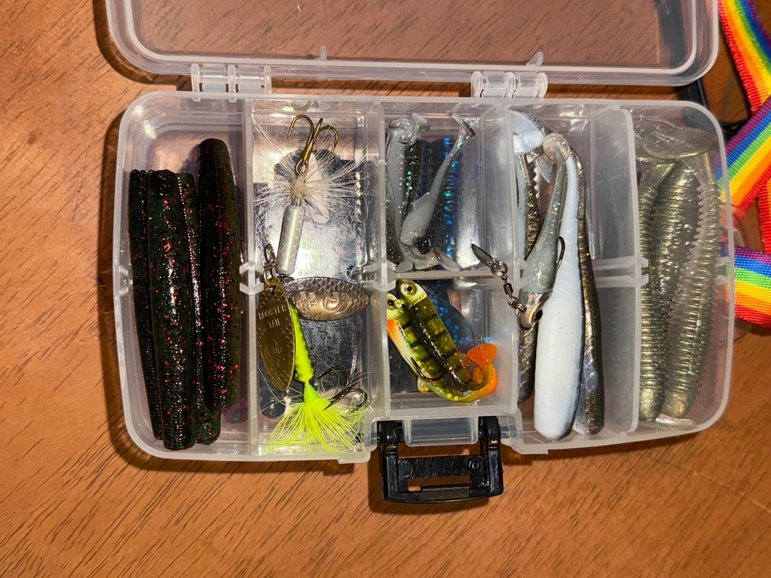 It’ll all hook to a belt the way I have it set up in a water proof box. But I’ve got Ned rigs and smaller ewg hooks, hover hooks and jigheads with spinners on the bottom. Swim ragers and flukes too.