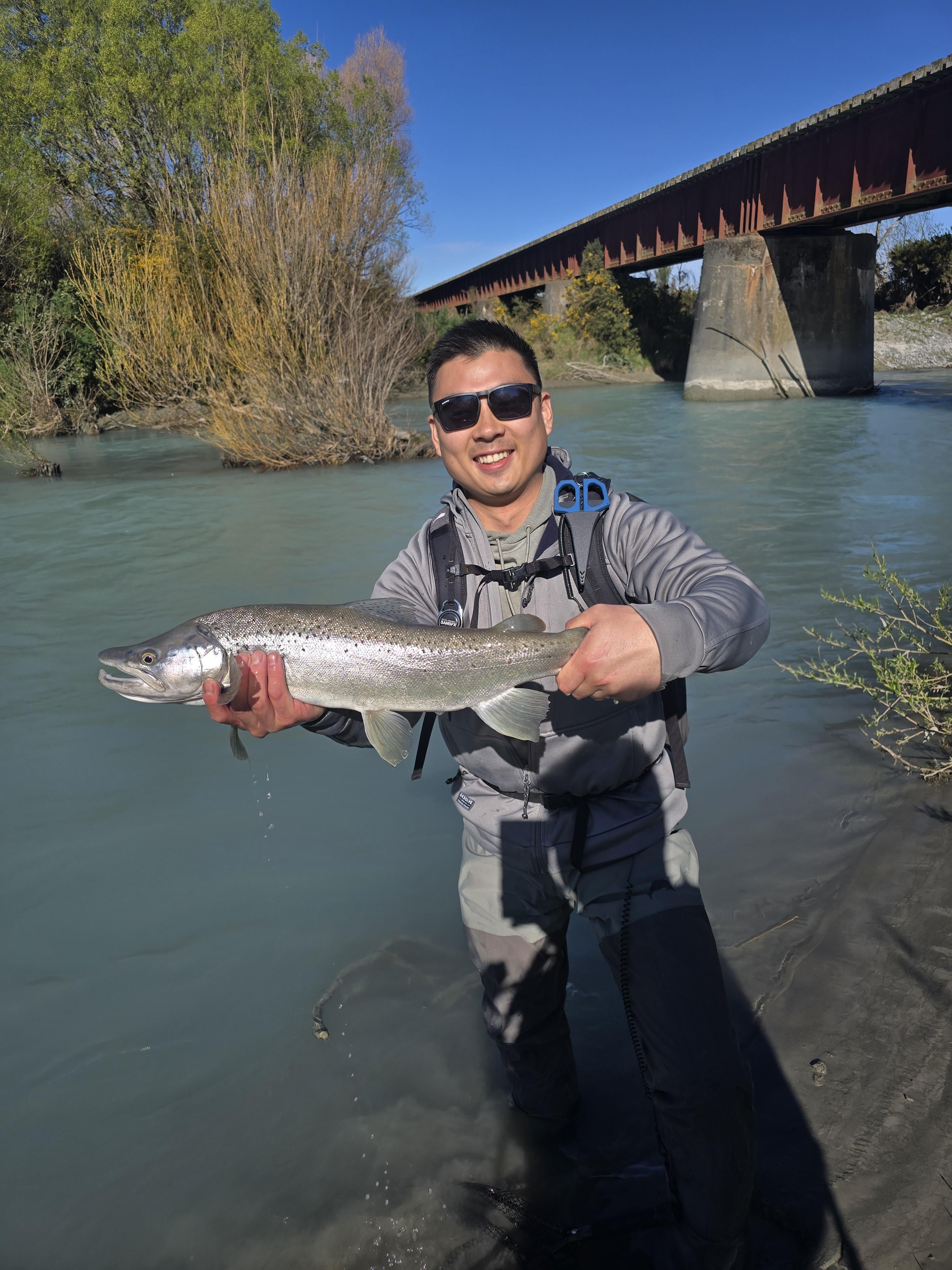 Brown trout caught in glacier fed river, very silver in colour. 25km upstream from the river mouth so I don't think they are sea run but does the silty environment affect their colours? No sight fishing here but still fun, 4.75lbs