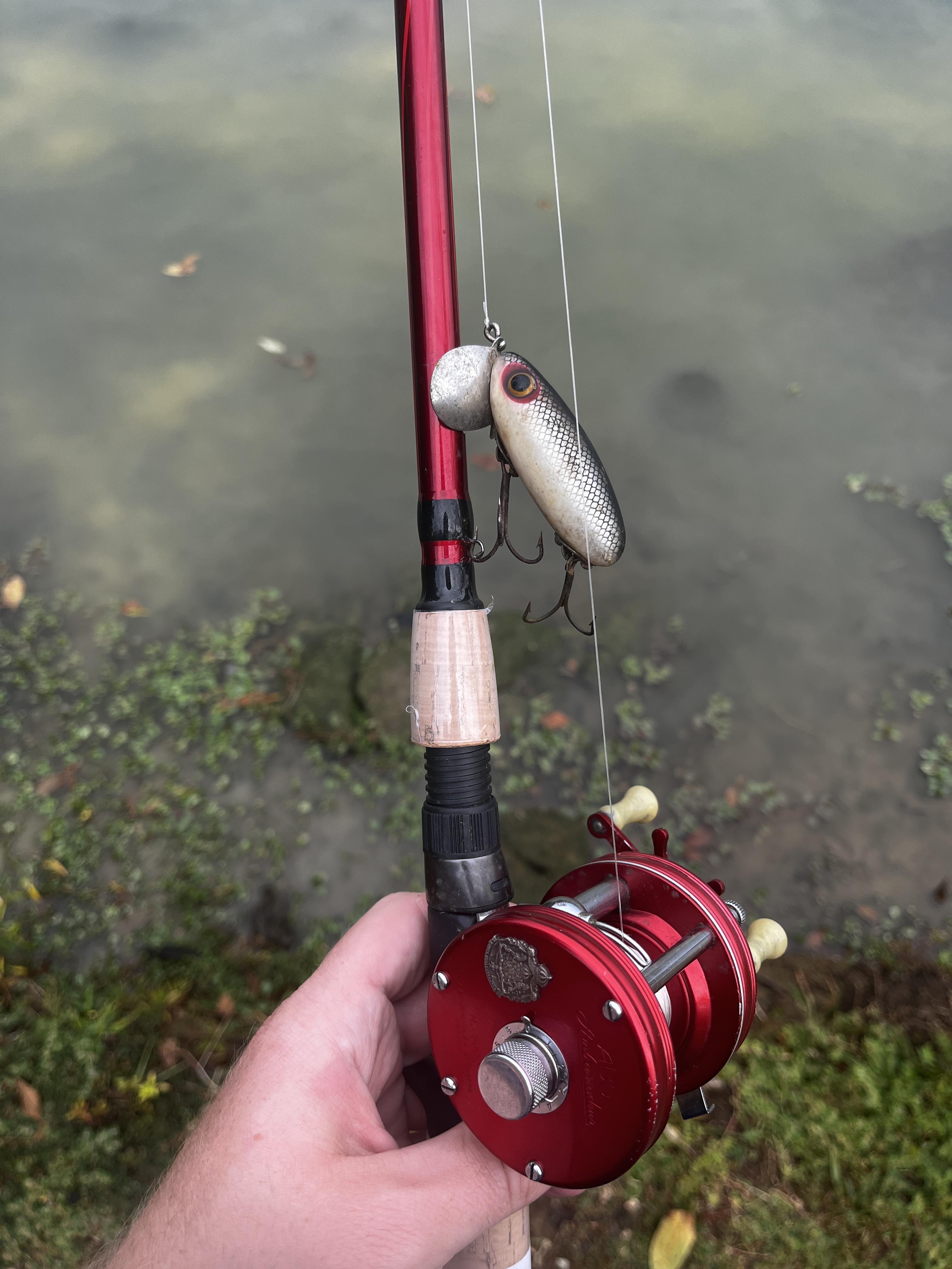 This is my great aunt’s Abu Garcia 5000, around a 1963 model. Found a matching rod at Walmart and put on an old jitterbug to try and catch a few fish on her old reel.