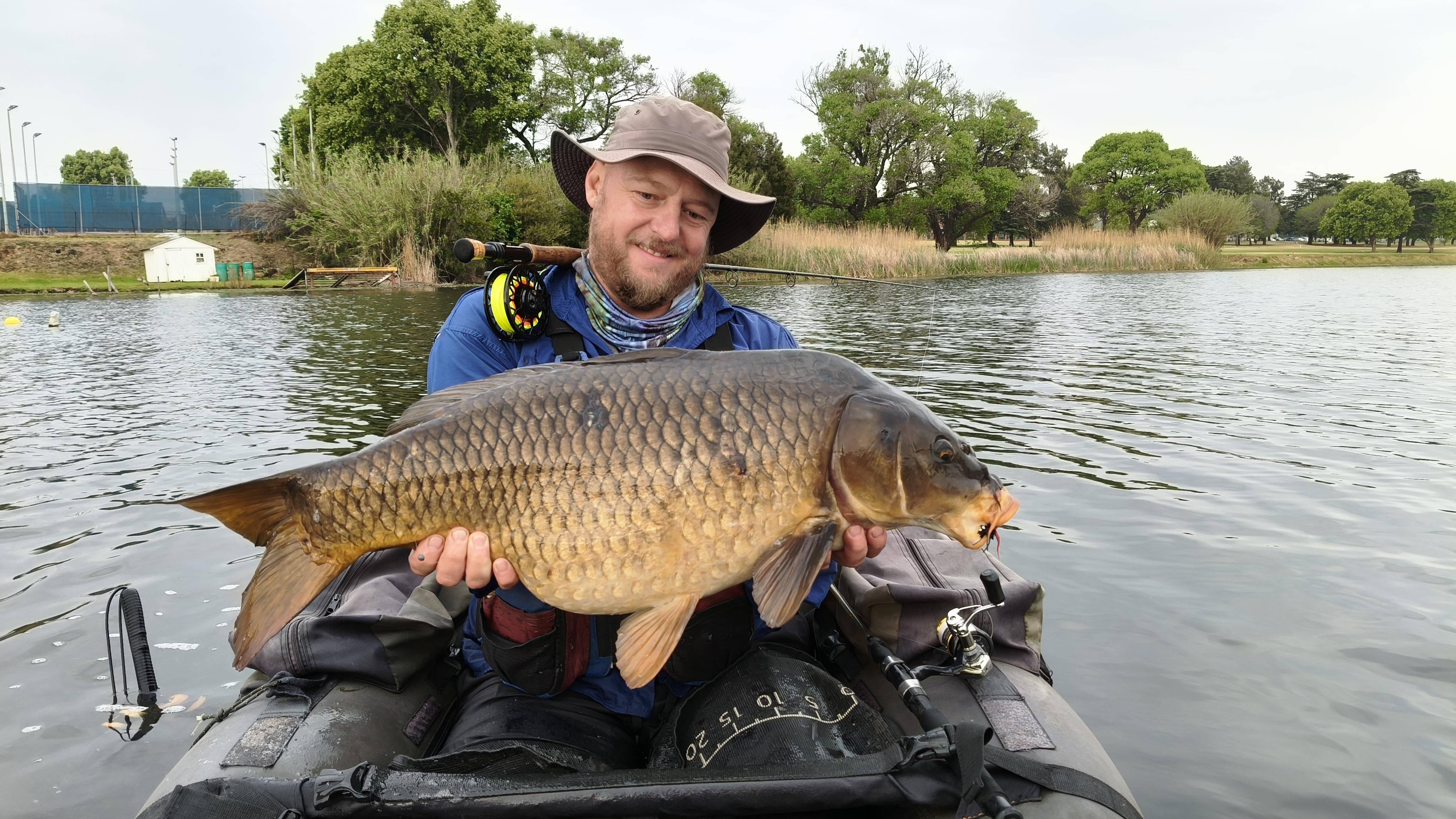 We fished a different dam Saturday morning with the flyrods. Wind was cold and very overcast. In the dam just above this dam, the carp started spawning Wednesday, so we thought we would also see spawning carp in this dam but there was no spawning yet. Both carp we got are fat and obviously full of eggs. My friend got a 6.5kg and I managed a 10.7kg.