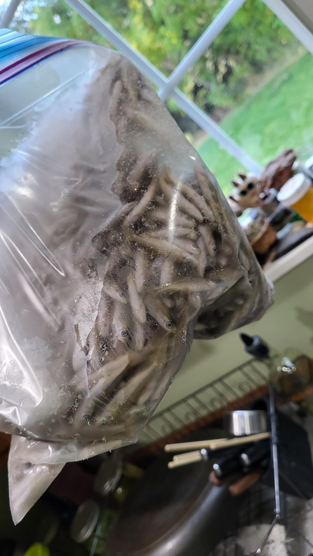 They shut off the irrigation ditch that runs through my yard. These guys were stranded in a puddle. So I netted them up and now I have frozen minnows for bait for the rest of the year. All legal bait species.