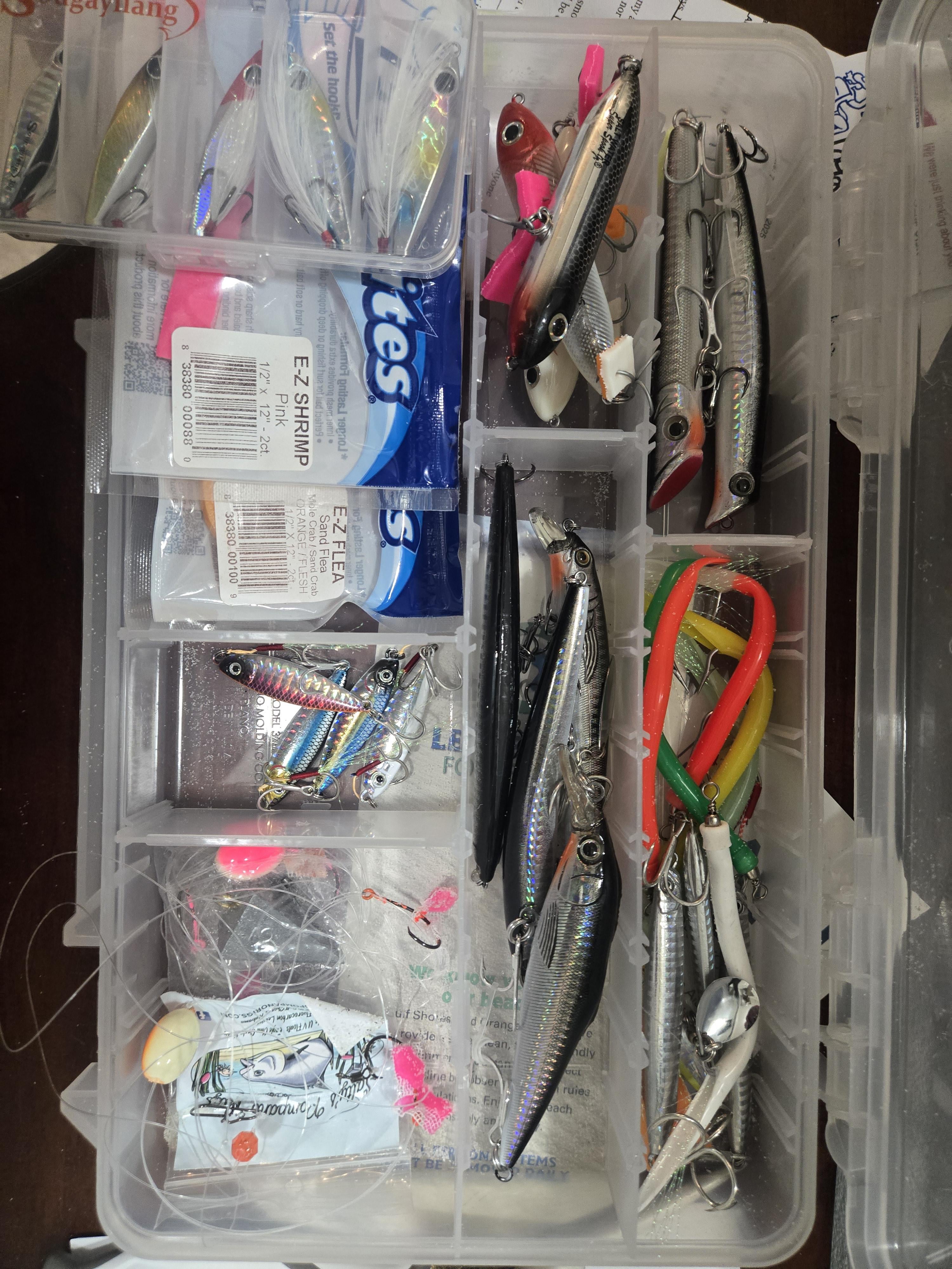 So that's the assortment I've brought with me. I'm in Gulf Shores AL. I've had some luck with the pompano right but any of the other rigs I haven't had much luck with for top water. I was after some reds or anything else that would put up at least a fight. I have t tried the rubber lures in the top right yet.
