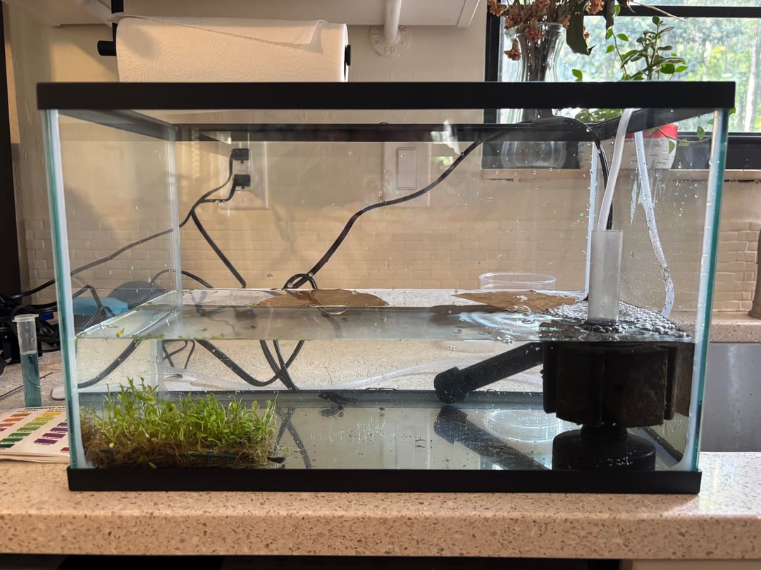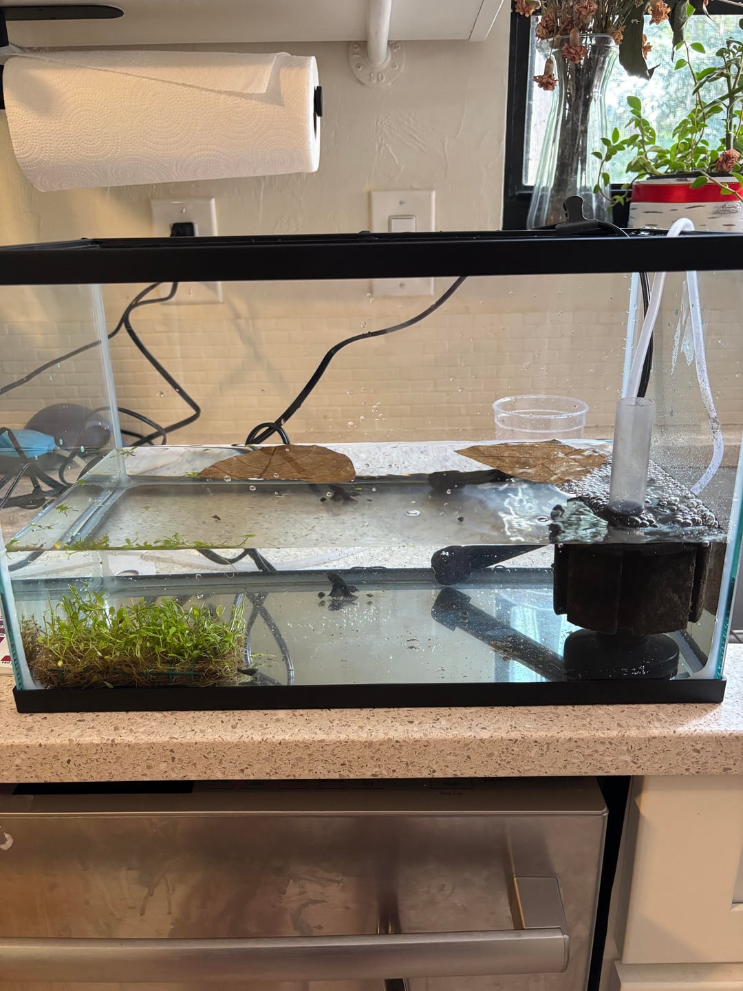 There is a picture of the 5 gallon tank, it has shallow water so it can swim up (it barely can). Is this shallow enough? The tank is 80 degrees, has 1 catappa leaves and a plant for him to hide. It has the sponge filter but it’s not on because the tank is too shallow, but an air stone is on. Does it need a filter if I’m already going to be doing heavy water changes since it’s basically cycling with fish in? I put the air stone inside the sponge filter. All params at 0 since it’s new tank, pH slowly lowering down to 7 (I live in FL so the water here is very hard).